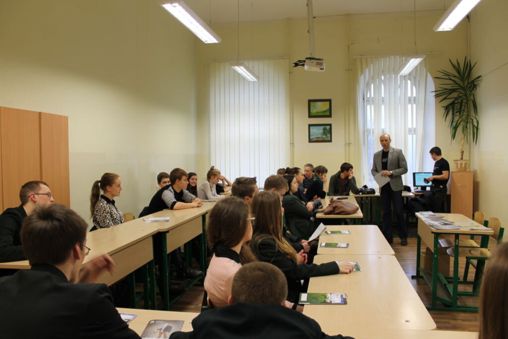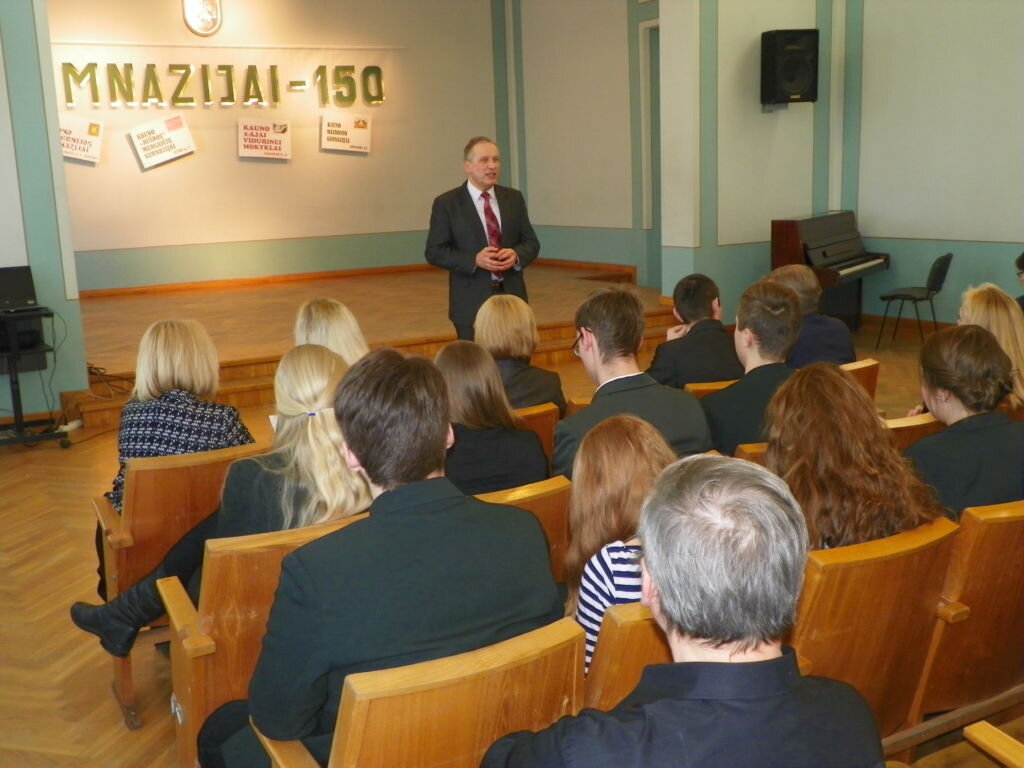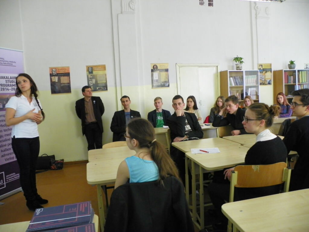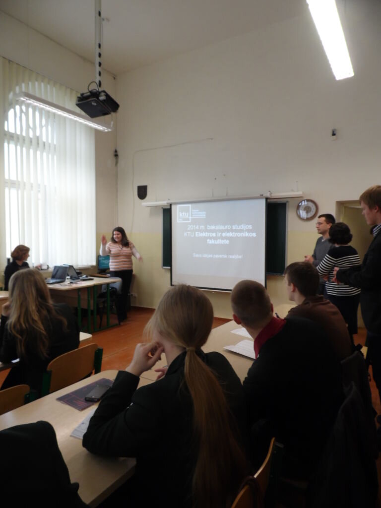 Kovo 26-oji – fizinių ir technologijos mokslų studijų diena. Šįkart į gimnazijos klases susirinko dėstytojai ir studentai iš šešių skirtingų Lietuvos universitetų (KTU, MRU, VDU, VU, VGTU, ASU) bei pristatė daugiau kaip keturiasdešimt studijų programų. Šurmuliuojančiose klasėse mokiniai galėjo pasiklausyti apie visiems jau žinomas pagrindines studijų programas bei išgirsti apie naujas, tik prieš keletą metų pasiūlytas. Dėstytojai nuoširdžiai atsakinėjo į mokinių užduodamus klausimus, laužė nusistovėjusius stereotipus. Pasak Kauno Technologijos universiteto informatikos fakulteto dėstytojo, klaidinga manyti, kad informatikos studijas renkasi tik vaikinai. Merginų, studijuojančių informatiką, tikrai netrūksta. Mokiniai ypač džiaugėsi, jog gimnazijoje galėjo susitikti ir pabendrauti ne tik su universitetų dėstytojais, tačiau ir su pačiais studentais, kurie mielai dalijosi savo patirtimi. Fizinių ir technologijos mokslų studijų dieną gimnazijoje apsilankė 573 mokiniai iš 19 Kauno miesto ir rajono bendrojo ugdymo mokyklų.