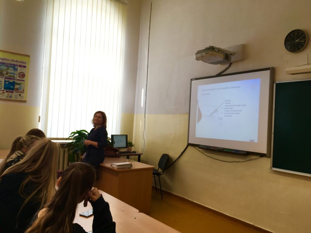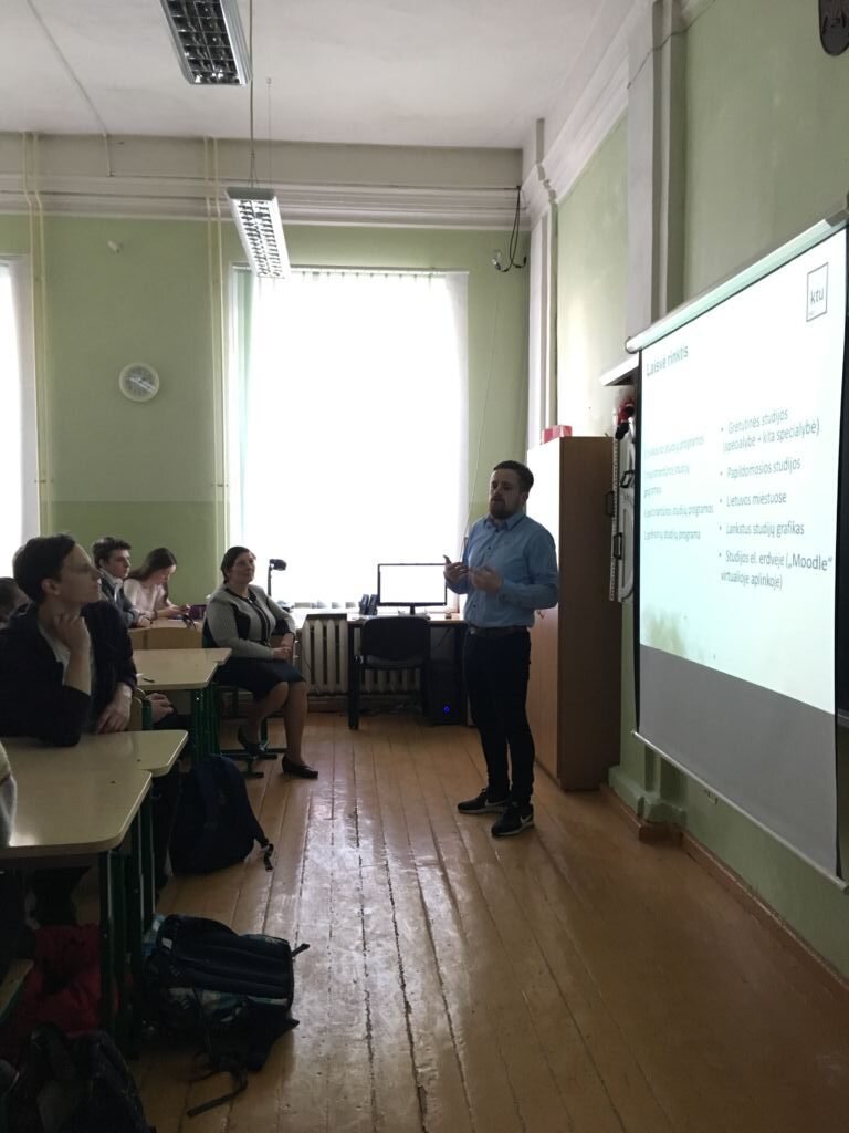 Trečiadienį – fizinių, informatikos, matematikos, inžinerijos ir technologijos mokslų studijų dieną – keturių universitetų ir Kauno kolegijos atstovai gimnazijoje pristatė per septyniasdešimt studijų programų. Gausus būrys mokinių susipažino su Kauno technologijos, Aleksandro Stulginskio, Vytauto Didžiojo universitetų, Vilniaus universiteto ir šio universiteto Kauno humanitarinio fakulteto bei Kauno kolegijos siūlomomis studijų galimybėmis. Kauno technologijos universiteto Cheminės technologijos fakulteto lektorė Inga Radžiūnienė sudomino mokinius ne tik studijų programų pristatymu, bet įtraukė į diskusiją apie aktualią pasaulio užterštumo problemą ir paskatino „mąstyti globaliai, o veikti lokaliai“. Apsilankiusius Vytauto Didžiojo universiteto Informatikos fakulteto studijų programų (informatikos sistemos, matematika ir jos taikymas, multimedijos ir interneto technologijos) pristatymuose patraukė ir programų turinys, ir studijų bei karjeros perspektyvos. Iš lektoriaus Vytauto Barzdaičio mokiniai sužinojo naują terminą „dirbtinis intelektas“, išgirdo, kaip spręsti verslo užduotis, kaip, naudojant „lengvas“ technologijas, galima sukurti programų. Profesorius Ričardas Krikštolaitis papasakojo apie matematikos taikymą finansų, energetikos, biomedicinos, statistikos srityse. Jis pabrėžė, kad geras matematikos žinių valdymas leidžia lengvai spręsti optimizavimo, duomenų analizės, matematinių modelių kūrimo uždavinius. Lektorius ypač nudžiugino puikiomis matematikos-informatikos absolventų įsidarbinimo perspektyvomis ir geru atlyginimu. Įdomiai ir išsamiai studijų perspektyvas pristatė ir Kauno kolegijos atstovai, supažindinę su maisto technologijų – viešojo maitinimo ir dietetikos – studijų programomis. Mokiniai sužinojo, kad didelį studijų užima praktinė veikla, išgirdo, kokiose įstaigose ir įmonėse ta praktika atliekama. Kolegijos studentai pristatė savo organizuojamus renginius, o susitikimo pabaigoje pavaišino pačių gamintomis salotomis, kurių ingredientus mokiniai turėjo atspėti. Daug gerų atsiliepimų buvo pasakyta ir apie kitus tos dienos lektorius bei jų pasirengimą.