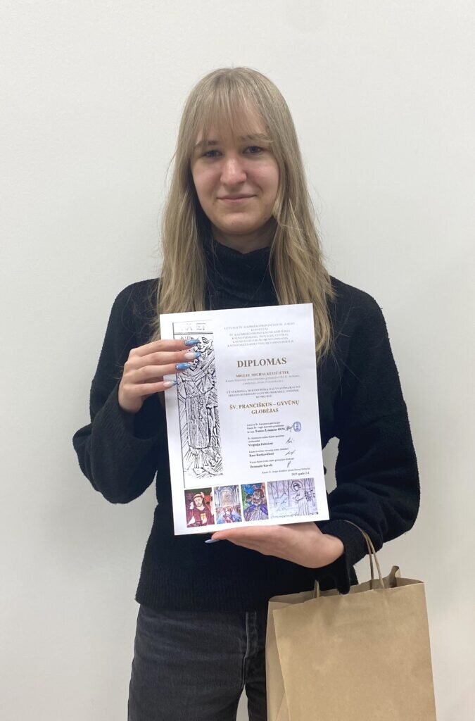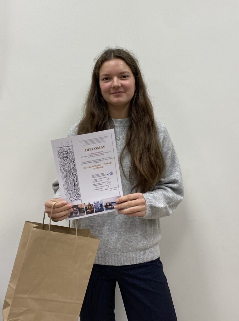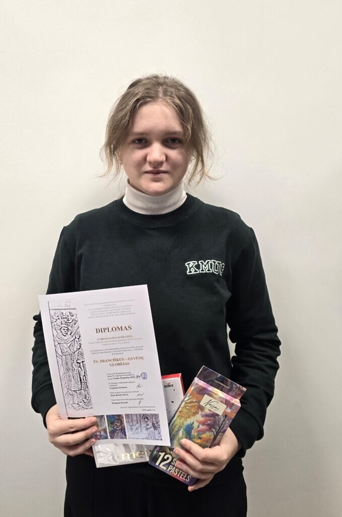 Iš gausaus dalyvių būrio net trys mokinės tapo laureatėmis: Miglė Michalkevičiūtė (IIId kl.) – už grafikos darbą „Šv. Pranciškaus meilė gyvūnams“, Gabija Samajauskaitė (IIIf kl.) – už mišria technika sukurtą darbą „Pranciškaus atspindys“, Marija Meliešaitė (IIb kl.) – už fotografijų diptiką „Trapios sparnų paslaptys“. Jaunųjų kūrėjų darbai, eksponuojami sakralioje bažnyčios erdvėje, spindi nuoširdumu, kūrybine įvairove ir savitu požiūriu į Šv. Pranciškų bei gyvūnų globos temą. Kviečiame aplankyti konkursinių darbų parodą Šv. Jurgio Kankinio bažnyčioje, kuri veiks visą spalio mėnesį, ir pasigrožėti mūsų mokinių kūryba!