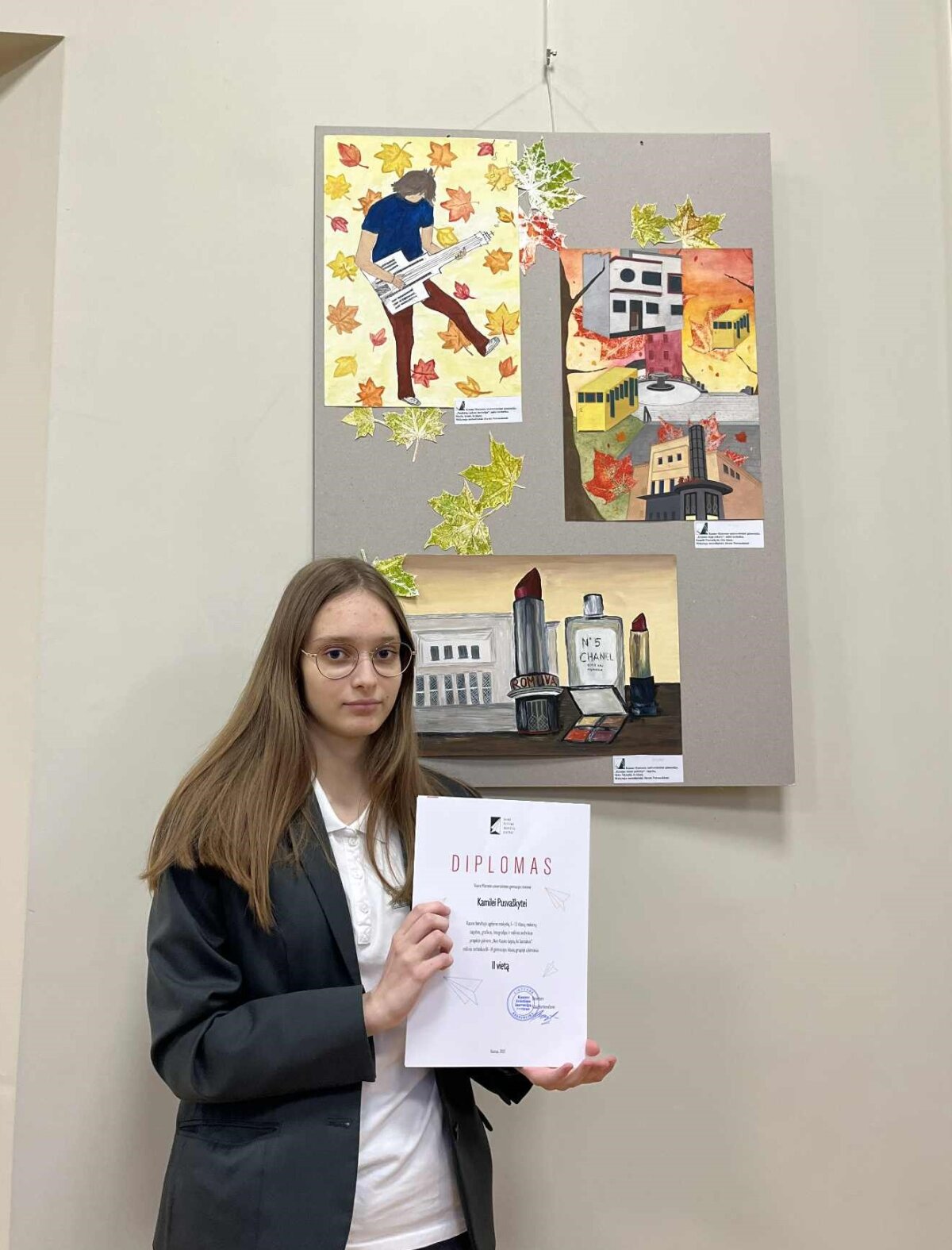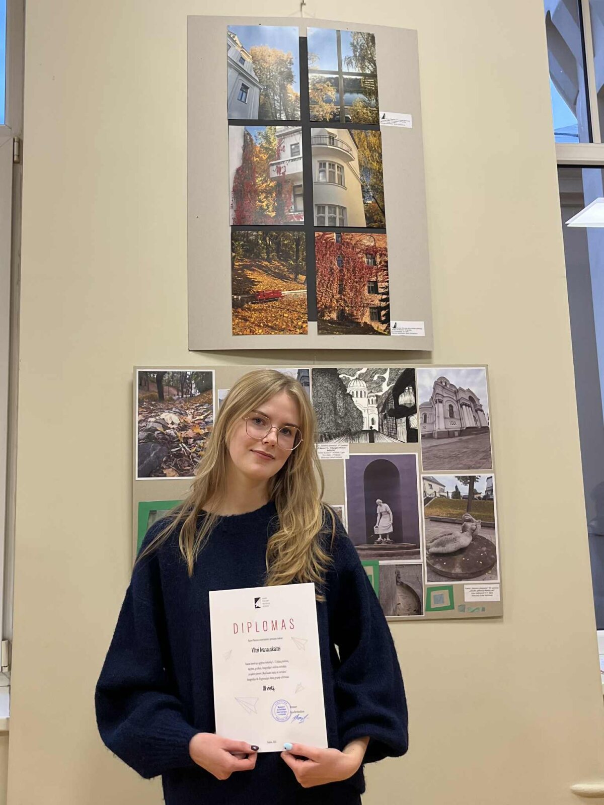 Gruodžio 11 d. Kauno švietimo inovacijų centre vyko Kauno bendrojo ugdymo mokyklų 5–12 klasių mokinių tapybos, grafikos, mišrios technikos ir fotografijos projekto-plenero „Nuo Kauko laiptų iki Santakos“ ir jo laureatų apdovanojimo šventė. Šiemet dalyvių skaičius nebuvo ribojamas, todėl sulaukta itin gausaus kūrėjų būrio. Mūsų gimnazijai atstovavo net 17 mokinių: 10 jų pristatė savo fotografijas ar fotografijų serijas, o 7 – tapybos ir mišrios technikos kūrybinius darbus. Džiaugiamės, kad mūsų gimnazistų kūryba buvo pastebėta ir įvertinta prizinėmis vietomis: Mėta Šlėnaitė (Ie ) – I vieta (tapyba, I–II gimn. klasių amžiaus grupė), Kamilė Pusvaškytė (IVc) – II vieta (mišri technika, III–IV gimn. klasių amžiaus grupė), Kotryna Vaidelytė (IIb) – I vieta (fotografija, I–II gimn. klasių amžiaus grupė), Ema Čičinytė (IIc) – II vieta (fotografija, I–II gimn. klasių amžiaus grupė), Viltė Ivanauskaitė (IVe) – III vieta (fotografija, III–IV gimn. klasių amžiaus grupė). Didžiuojamės visais dalyviais ir jų dailės mokytoja Jūrate Petrauskiene, taip pat jų kūrybiniais atradimais. Kiekvienas darbas – tai savitas žvilgsnis į miestą, jo erdves ir nuotaikas.