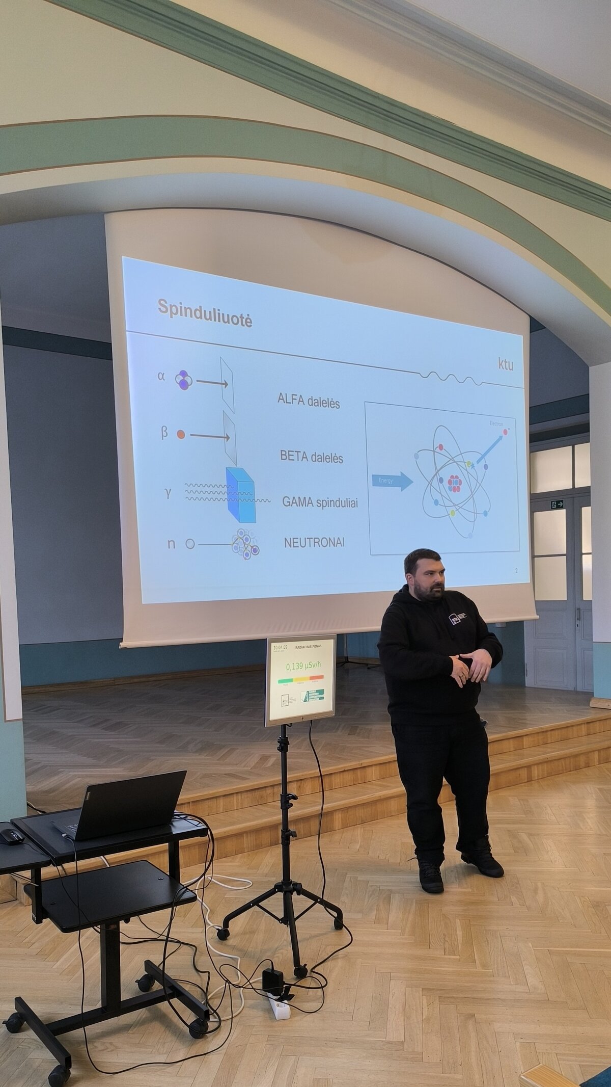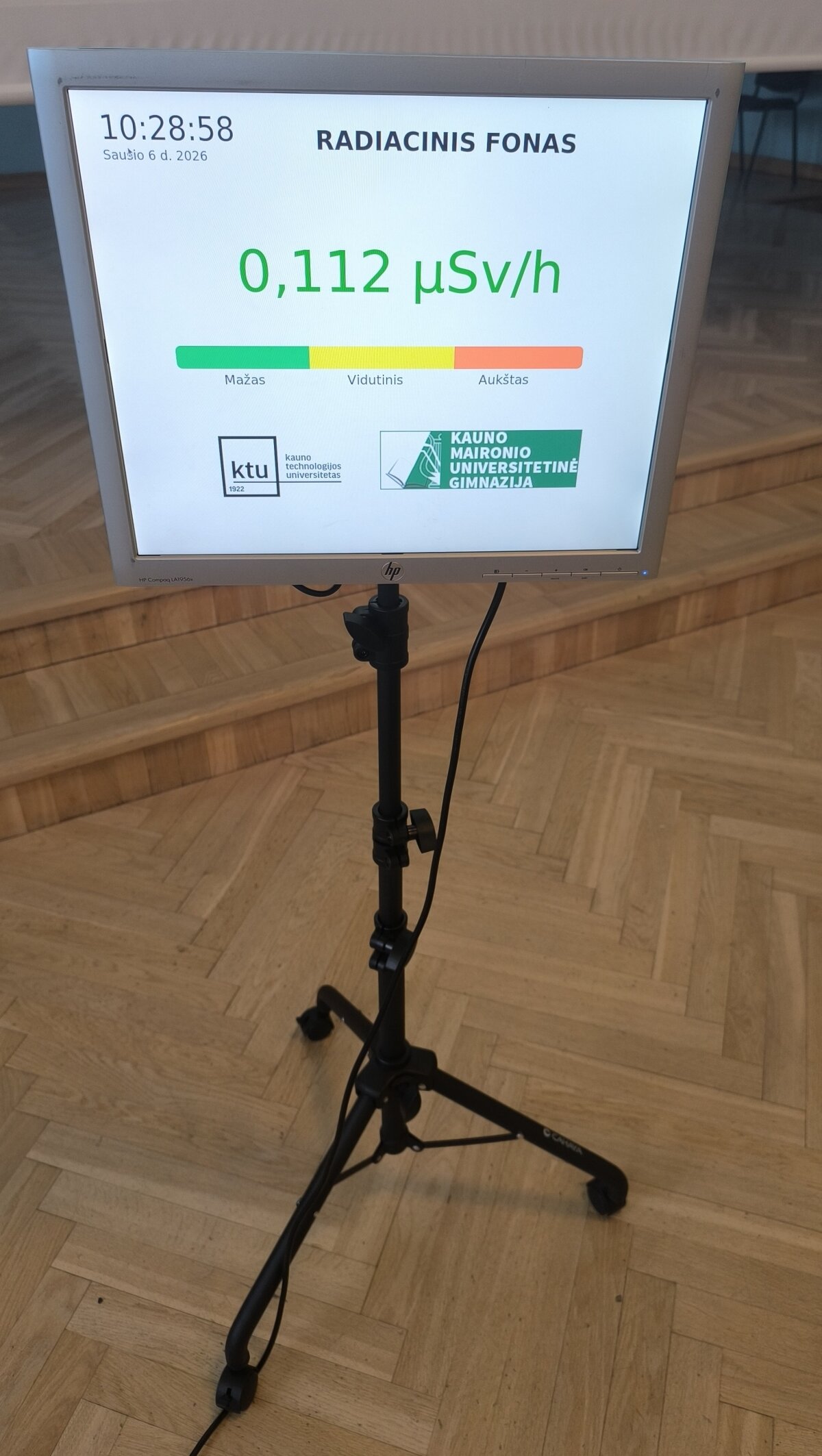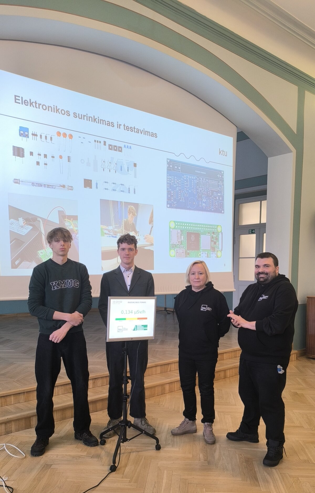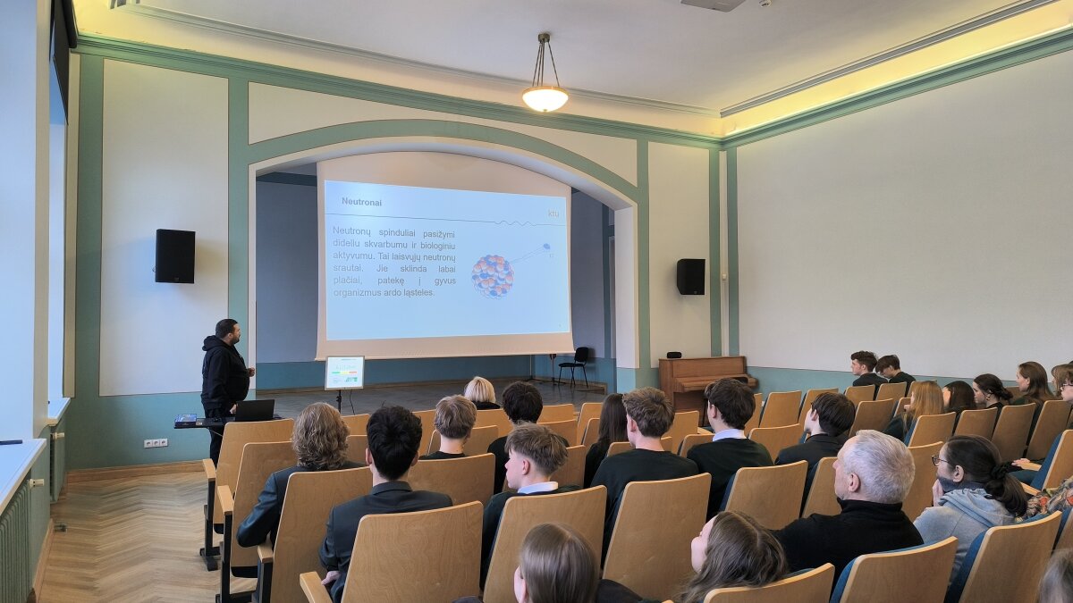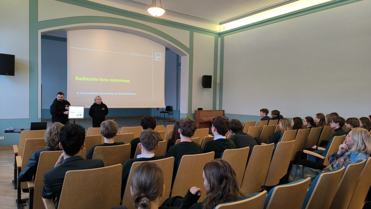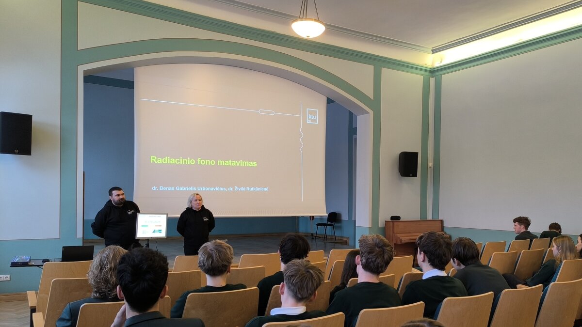 Sausio 6 d. gimnazijoje lankėsi Kauno technologijos universiteto Matematikos ir gamtos mokslų fakulteto studijų programų vadovas doc. dr. Benas Gabrielis Urbonavičius ir šio fakulteto studijų prodekanė doc. dr. Živilė Rutkūnienė. Jie pristatė radiacinio fono matuoklį, skirtą naudoti viešose vietose. Džiaugiamės ir didžiuojamės IVb klasės gimnazistais Martynu Kondrotu ir Roku Černiausku, kurie, dalyvaudami Kauno miesto tarpdisciplininėje itin gabių mokinių ugdymo programoje ir dirbdami kartu su kuratoriumi doc. dr. Benu Gabrieliumi Urbonavičiumi bei grupe kitų Kauno gimnazistų, turėjo galimybę įgyvendinti projektą – sukonstruoti devynis radiacinio fono matuoklius Kauno gimnazijoms. Projektas prasidėjo nuo idėjos sukurti ką nors prasmingo, aktualaus ir įdomaus, todėl galiausiai buvo pasirinkta būtent ši idėja. Pasiskirstę grupėmis ir užduotimis bei prižiūrimi kuratoriaus, gimnazistai per aštuonis mėnesius sukonstravo devynis veikiančius įrenginius. Vienas iš jų buvo įteiktas ir mūsų gimnazijai, siekiant paskatinti bendruomenės narius stebėti radiacinį foną ir juo domėtis. Prietaisai matuoja radiacinį foną realiuoju laiku, todėl ekrane galima stebėti, kaip jis nuolat kinta. Dėkojame Martynui ir Rokui už pasidalytus įspūdžius bei unikalią patirtį dalyvaujant šiame kūrybiniame procese.