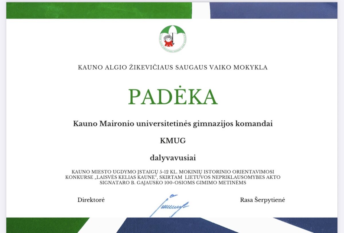 Kovo 12 d. vyko Kauno miesto ugdymo įstaigų pilietinio kultūrinio orientavimosi konkursas ,,Laisvės kelias“, skirtas Nepriklausomybės akto signataro Balio Grajausko 100-sioms gimimo metinėms paminėti. Konkurse dalyvavo Kauno miesto ugdymo įstaigų 5–12 klasių mokinių komandos, kurios interaktyvios programėlės pagalba atliko užduotis. Mūsų gimnazijos II e klasės komanda – Auksė Račkauskaitė, Augustė Bužinskaitė, Rusnė Sakalauskaitė ir Radvilė Krištaponytė – 10–12 klasių grupėje iškovojo I vietą. Merginos apdovanotos atminimo medaliais ir dovanų kuponu. Kita II e klasės merginų komanda – Vakarė Šimanskytė, Emilija Semaškaitė, Germantė Garkauskaitė ir Smiltė Lapienytė – 10–12 kl. grupėje iškovojo IV vietą. Komandas parengė istorijos mokytoja Rūta Barkauskaitė. Sveikiname gimnazistes su puikiais konkurso rezultatais!