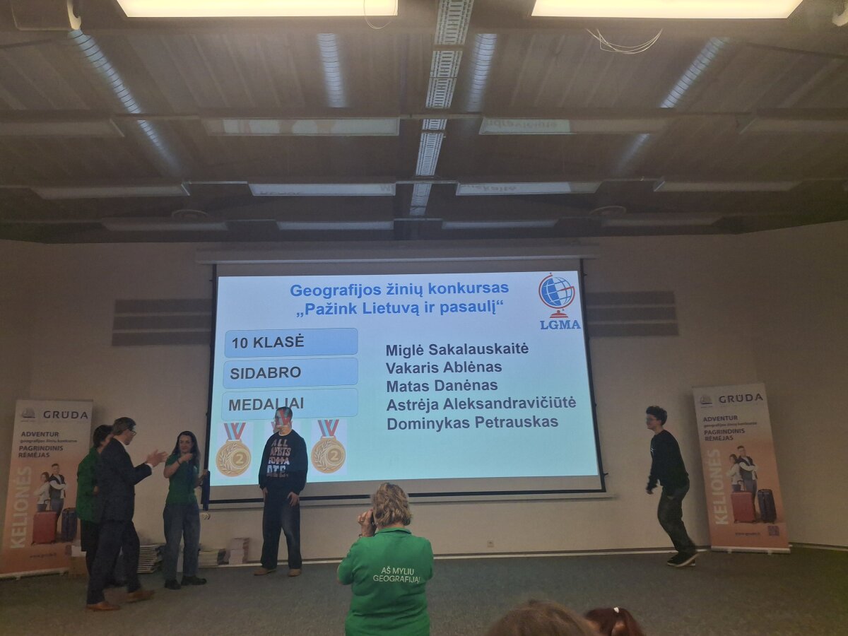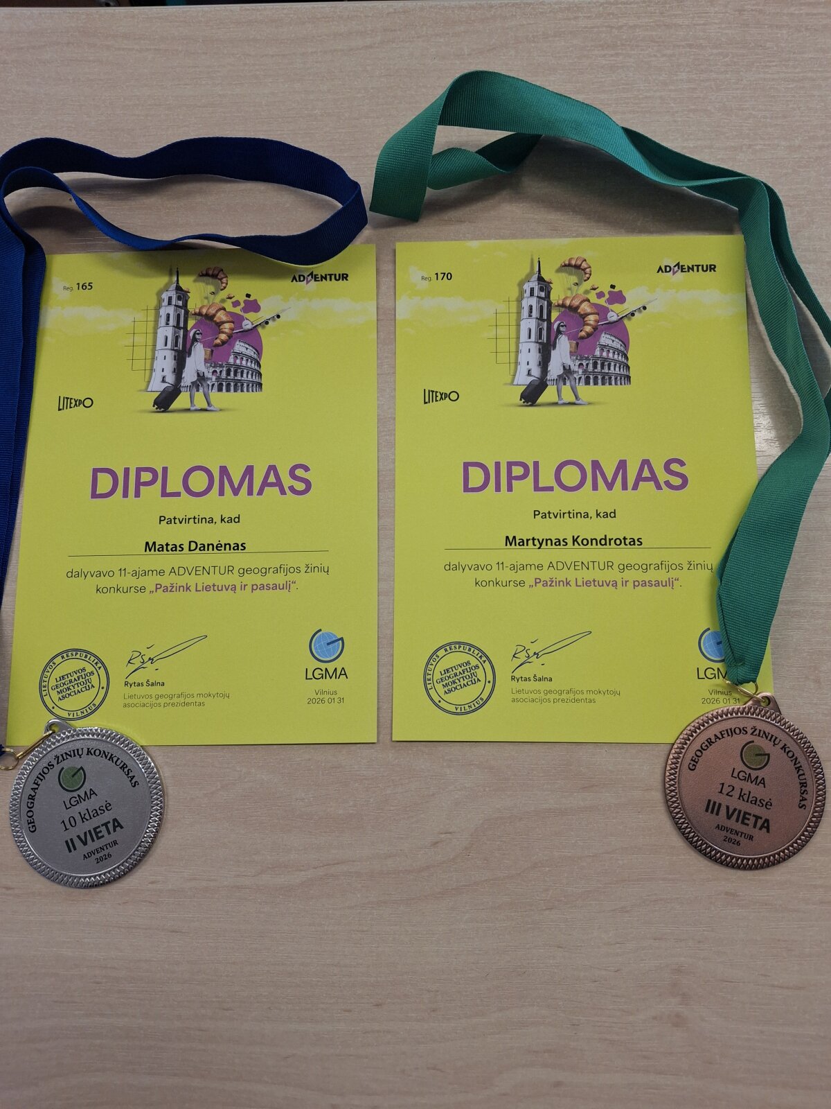 Sausio 31d. Lietuvos geografijos mokytojų asociacija kartu su tarptautine turizmo paroda „Adventur 2026“ LITEXPO parodų ir kongresų rūmuose organizavo Geografijos žinių konkursą „Pažink Lietuvą ir pasaulį“. Konkurso dalykinis turinys apėmė Lietuvos, Europos ir pasaulio kontekstą. Dalyviams teko atsakyti į įvairius klausimus, susijusius su aplinkosaugos, darnaus vystymosi, atsakingo vartojimo, turizmo išteklių įvairovės ir skatinimo aspektais. Konkurse kiekvienoje amžiaus grupėje dalyvavo po 500 mokinių iš visos Lietuvos. Mūsų gimnazijai atstovavo 10 mokinių. Labiausiai pasisekė IVb klasės mokiniui Martynui Kondrotui, laimėjusiam bronzos medalį (3 vieta) ir IIb klasės mokiniui Matui Danėnui, laimėjusiam sidabro medalį (2 vieta) bei rėmėjų įsteigtus prizus. Mokinius lydėjo geografijos mokytoja Jurgita Šilingienė.