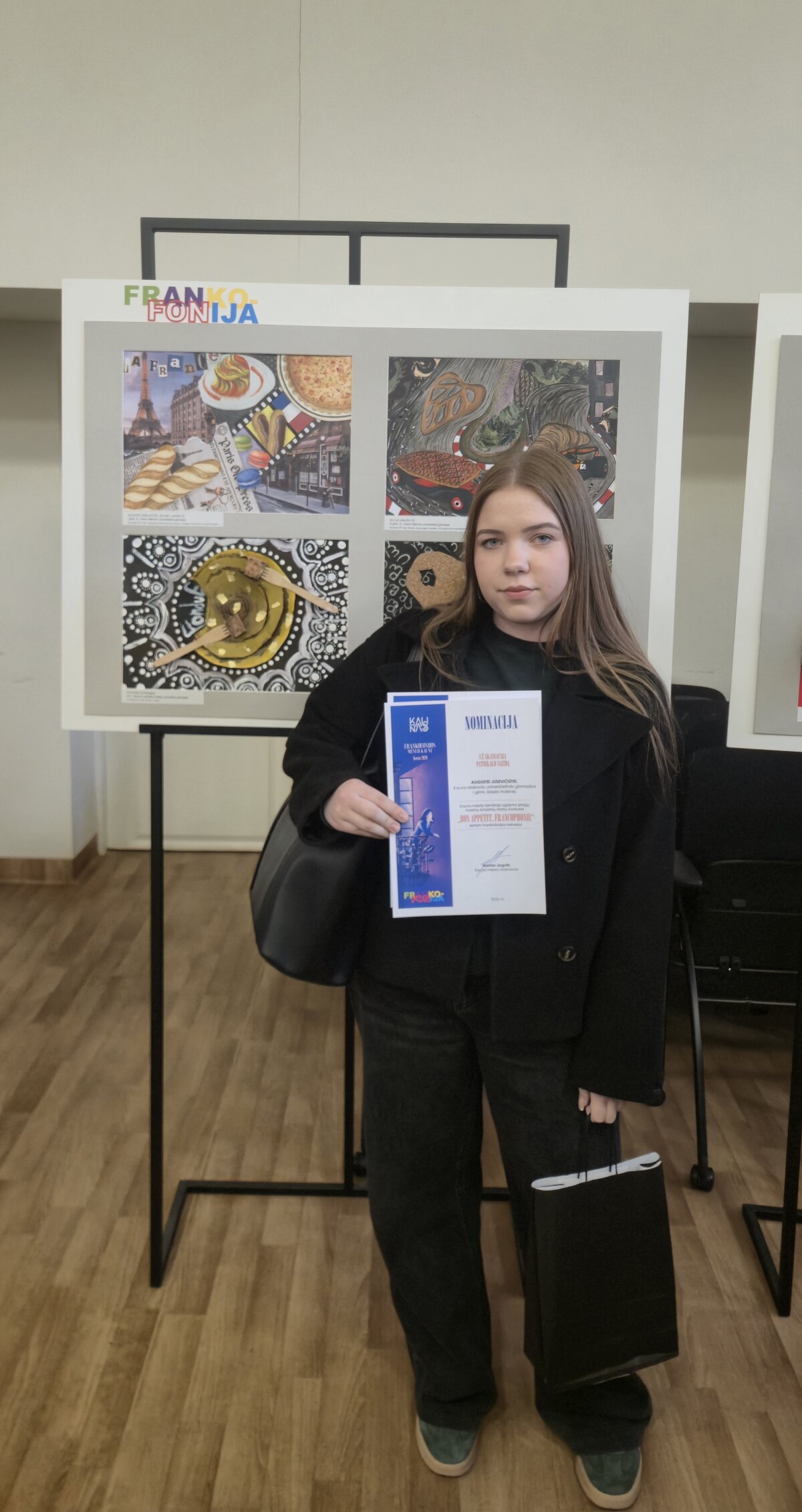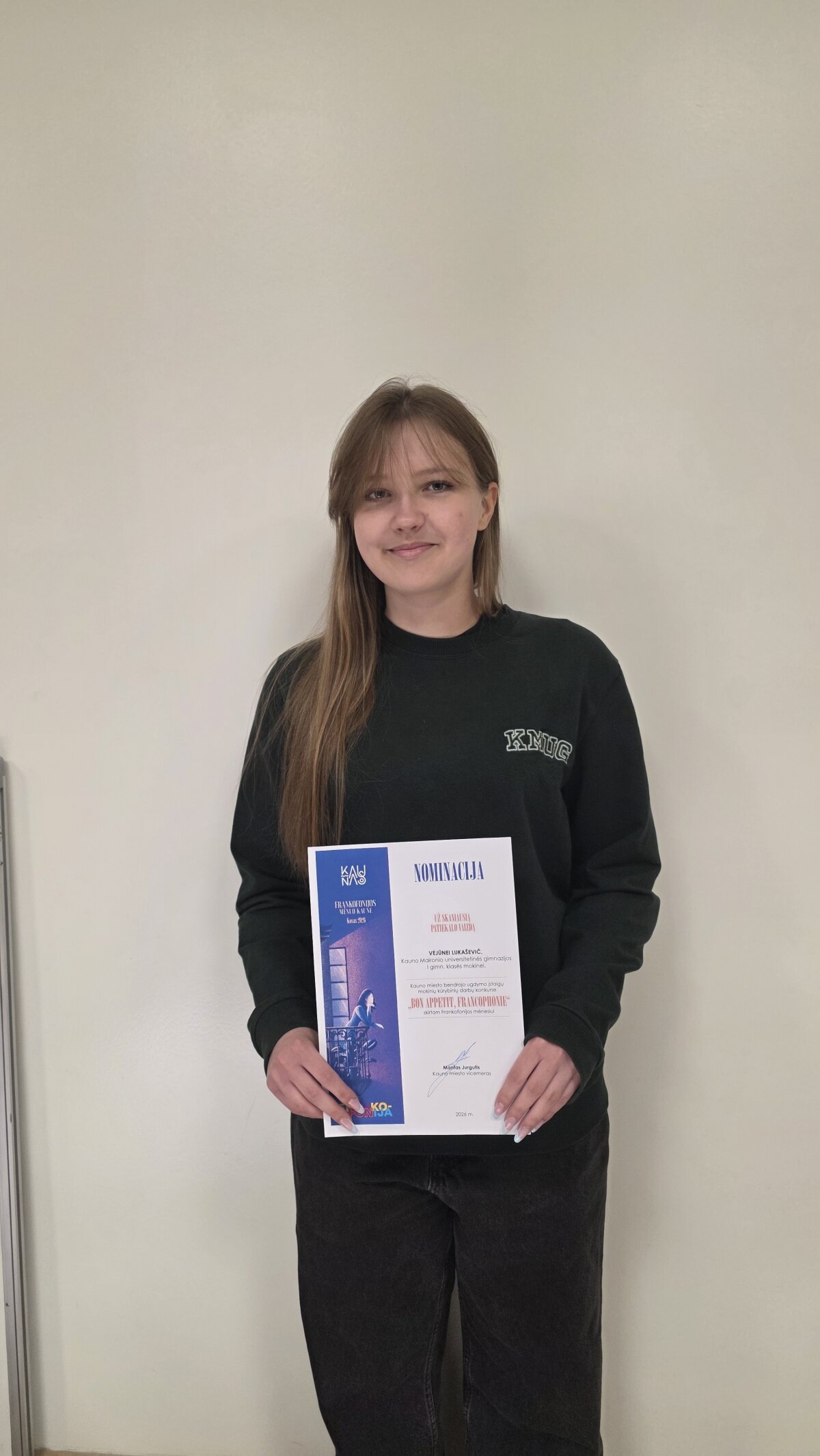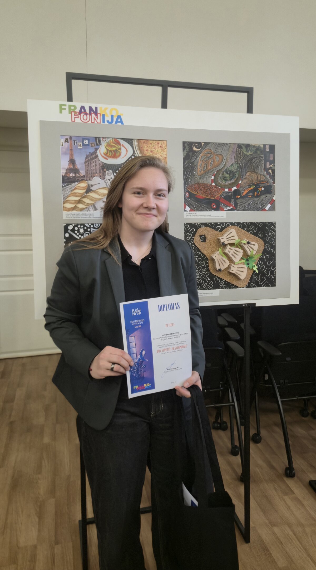 Simboliška, kad būtent balandžio 15-ąją, kai visas pasaulis švenčia Pasaulinę meno dieną, mūsų gimnazijos jaunosios kūrėjos skynė laurus Kauno miesto mokinių konkurse „Bon appétit, Francophonie“. Kauno švietimo inovacijų centre vykusi apdovanojimų šventė tapo kulminacine konkurso dalimi, vainikavusia visą kovo mėnesį trukusias Frankofonijos dienas, kurių metu laureatų darbai džiugino miestiečius PPC „Kauno Akropolis“ erdvėse. Apdovanojimų ceremonija nebuvo tik oficiali procedūra – tai tapo tikra švente sielai, akims ir gomuriui, kurioje menas galerijoje susitiko su menu lėkštėje. Nuoširdžiai sveikiname mūsų talentingąsias menininkes: Silviją Januškytę (III d), kurios kūrybinis darbas „Monako skonių vingiai ir posūkiai“ buvo įvertintas III vietos diplomu, bei Augustę Jusevičiūtę ir Vėjūnę Lukaševič (I f), pelniusias specialią nominaciją „Už skaniausią patiekalo vaizdą“ bendrame darbe „Prancūzų virtuvės spalvos ir skoniai“. Pasaulinė meno diena mokinėms ir jas ruošusiai dailės mokytojai Jūratei Petrauskienei įgavo ypatingą prancūzišką prieskonį, nes renginio metu „Vieno prancūzo sandėliukas“ ne tik supažindino su prancūziškų sūrių kultūra, bet ir pakvietė į gurmanišką jų degustaciją. Ši kultūrinė patirtis dar kartą įrodė, kad kūryba neturi ribų, o įvertinimas suteikia įkvėpimo ir toliau drąsiai nerti į naujus meno bei skonių atradimus.