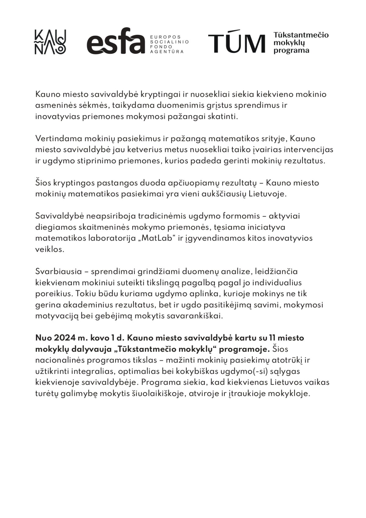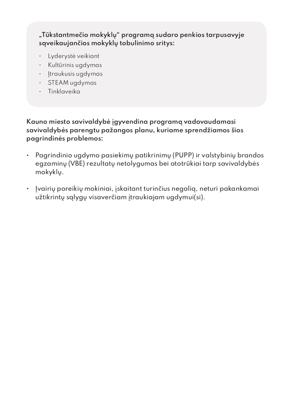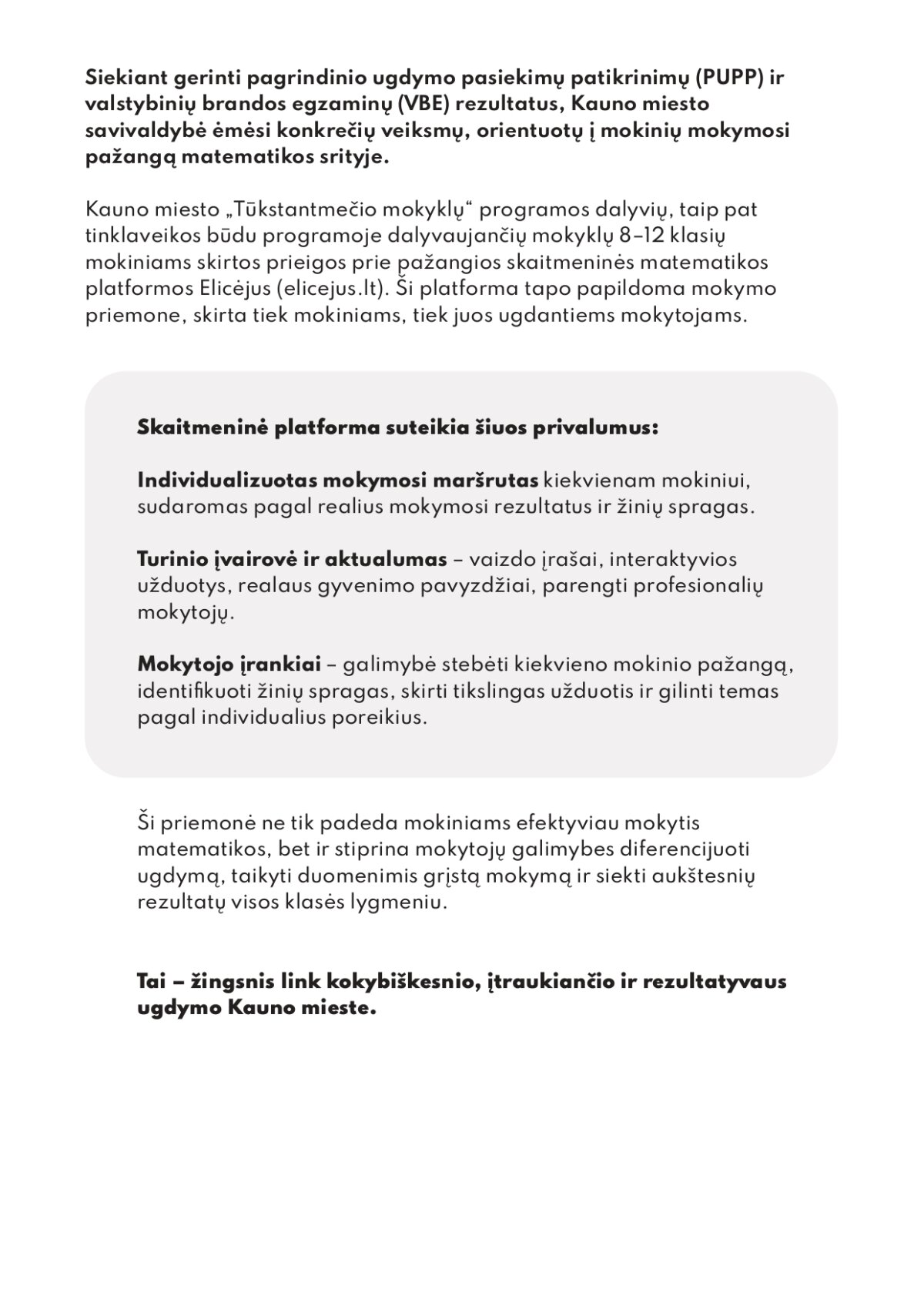 Siekiant gerinti pagrindinio ugdymo pasiekimų patikrinimų (PUPP) ir valstybinių brandos egzaminų (VBE) rezultatus, Kauno miesto savivaldybė ėmėsi konkrečių veiksmų, orientuotų į mokinių mokymosi pažangą matematikos srityje. Kauno miesto „Tūkstantmečio mokyklų“ programos dalyvių, taip pat tinklaveikos būdu programoje dalyvaujančių mokyklų 8–12 klasių mokiniams skirtos prieigos prie pažangios skaitmeninės matematikos platformos Elicėjus (elicejus.lt). Ši platforma tapo papildoma mokymo priemone, skirta tiek mokiniams, tiek juos ugdantiems mokytojams.