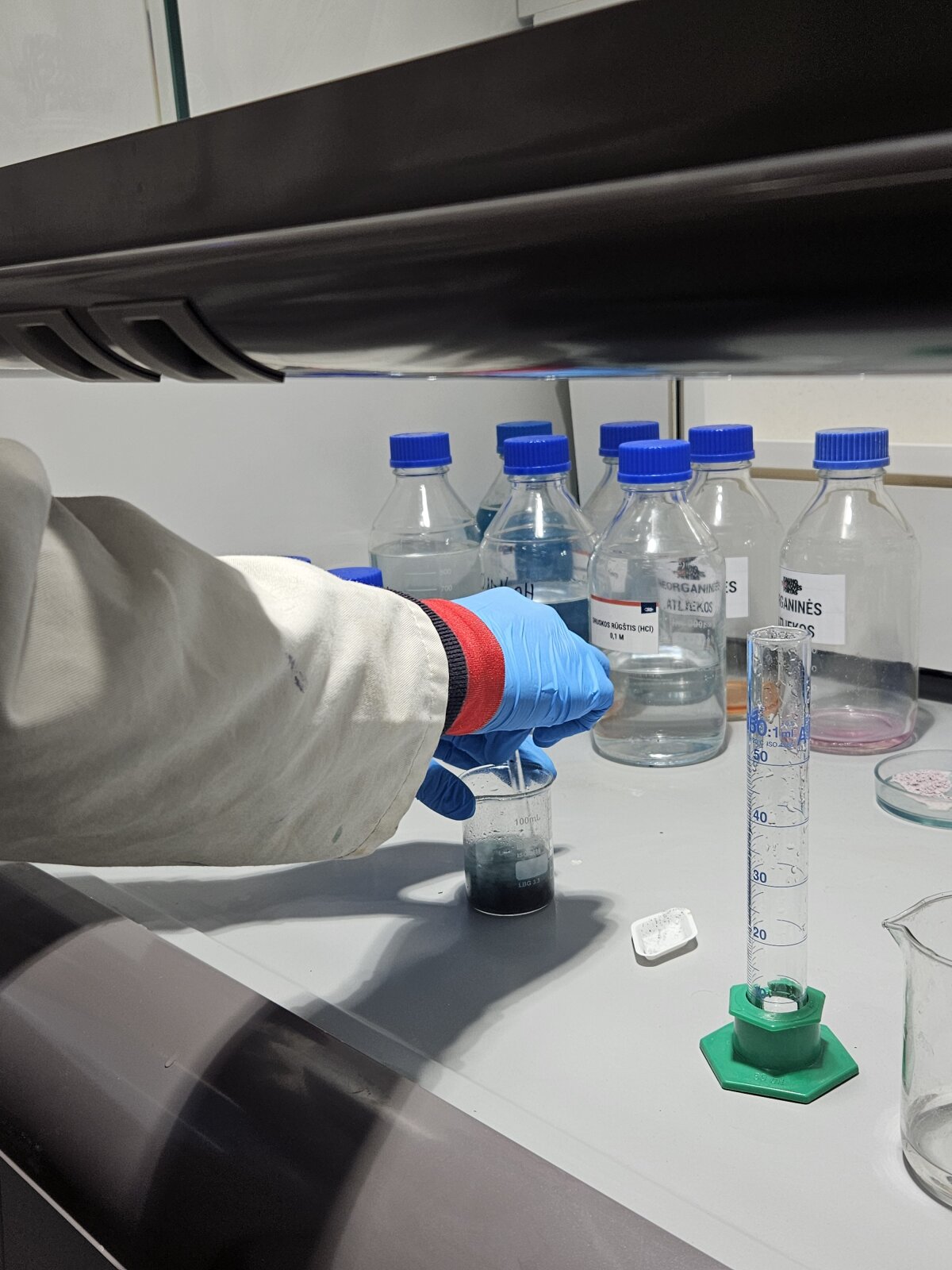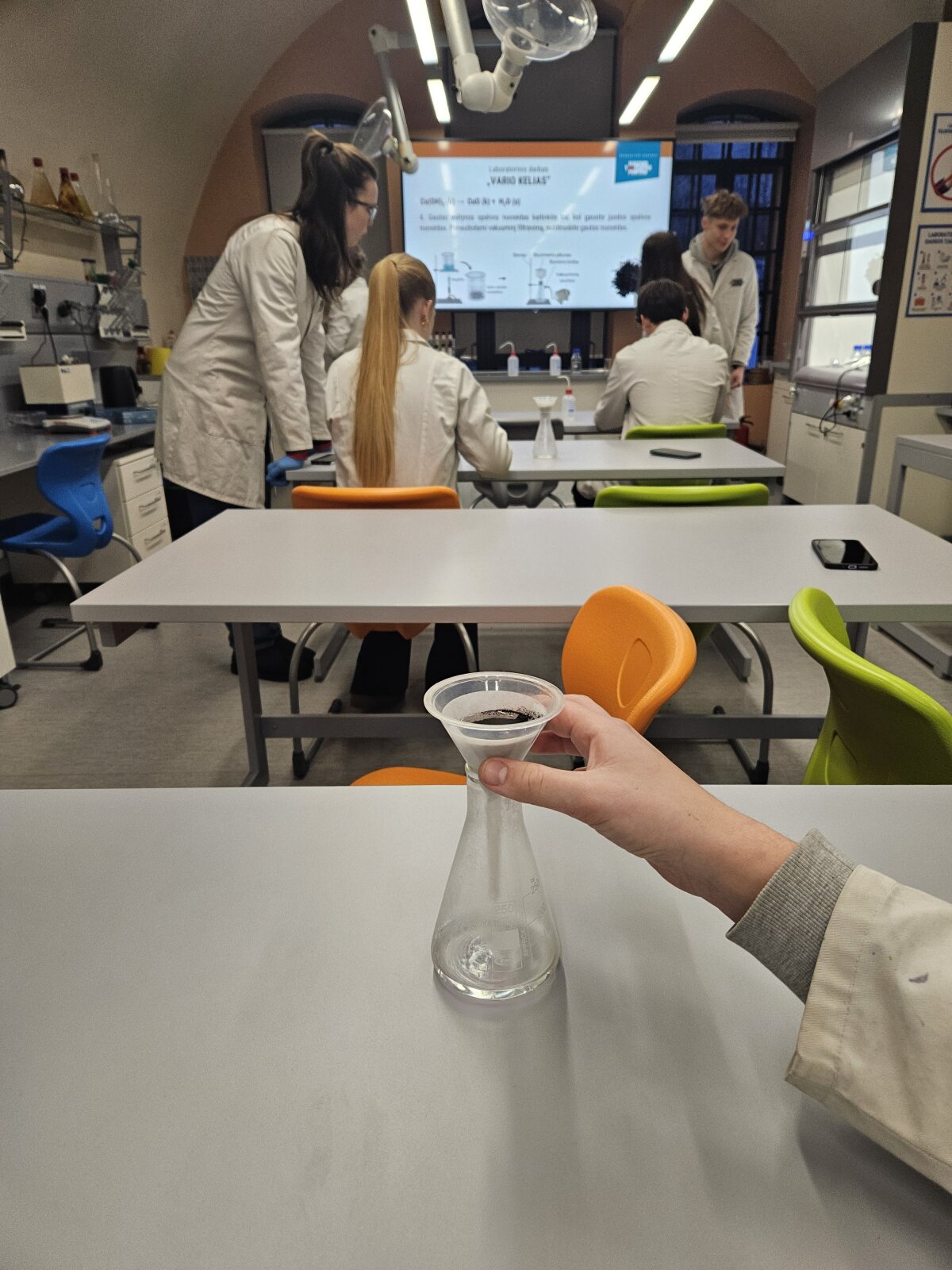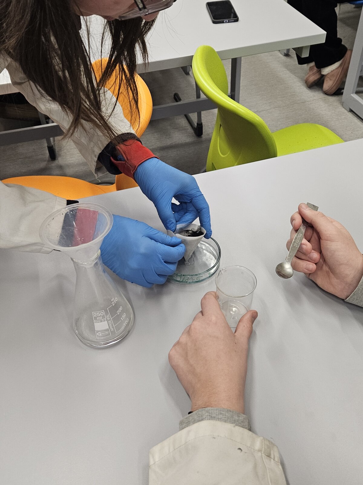 Didelė užsiėmimo dalis vyko traukos spintoje, todėl mokiniai praktiškai mokėsi saugaus darbo su pavojingomis cheminėmis medžiagomis: kaip tinkamai pasiruošti eksperimentui, laikytis saugos taisyklių ir atsakingai elgtis laboratorijoje.