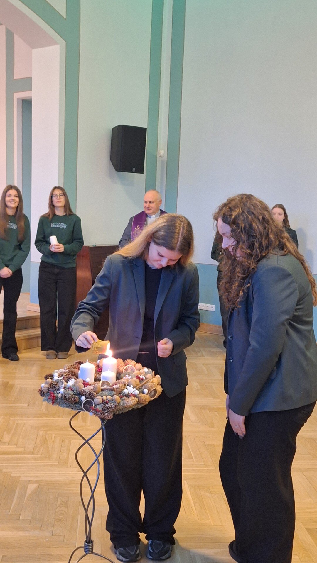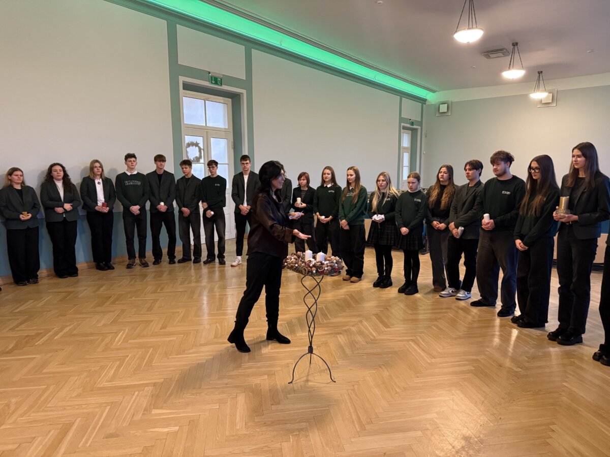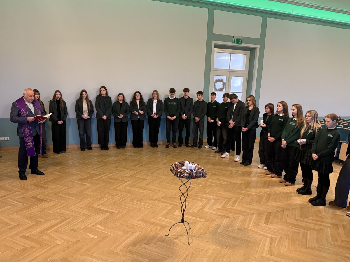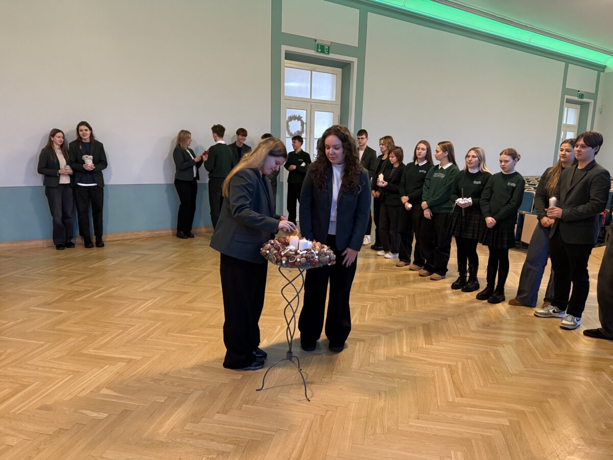 Gruodžio 1 d. rytą mokiniai kartu su gimnazijos kapelionu, kunigu Evaldu Vitulskiu, tikybos mokytoja Sandra Martinkiene ir administracijos atstovais susirinko simboliškai pradėti Advento laikotarpį – iškilmingai uždegė pirmąją Advento vainiko žvakę. Susitikimo metu mokytoja priminė, kuo ypatinga kiekviena vainiko žvakė, kokią prasmę ir viltį jos neša į tikinčiųjų širdis, skatindama susimąstyti apie laukimo, tylos ir pasiruošimo svarbą.