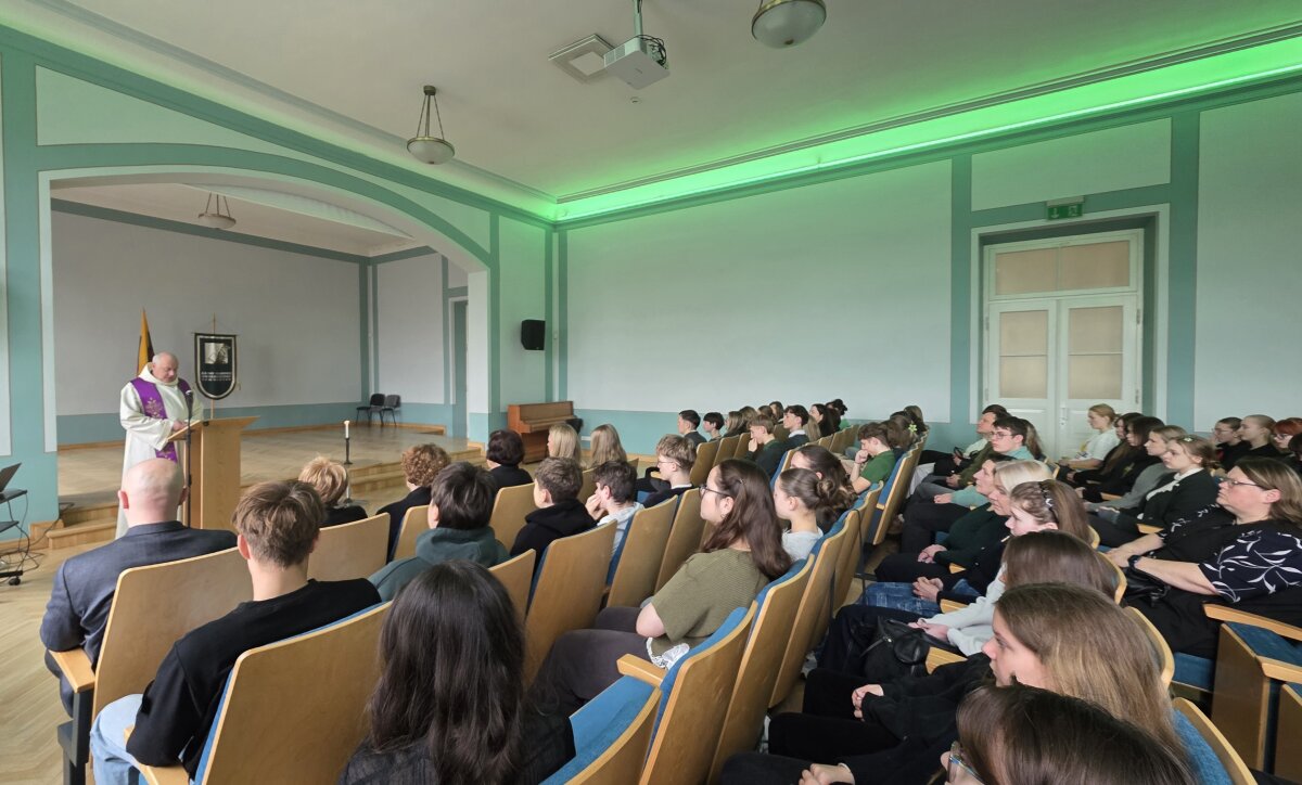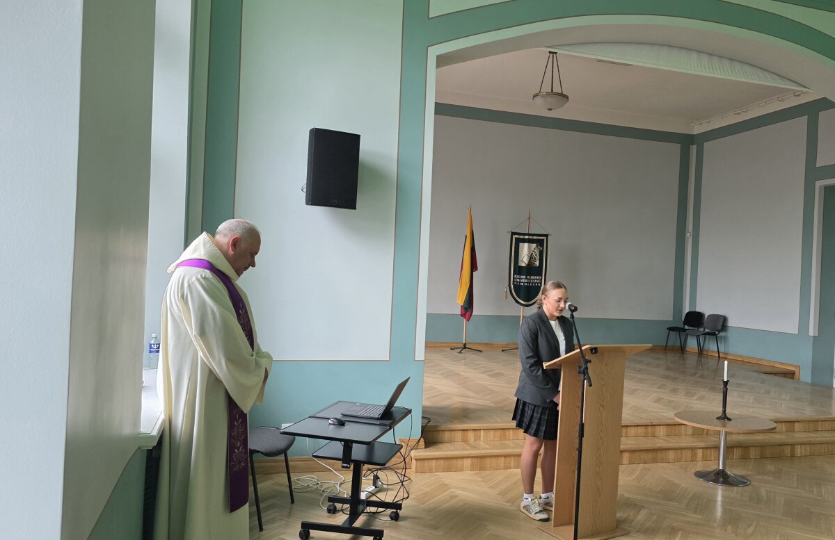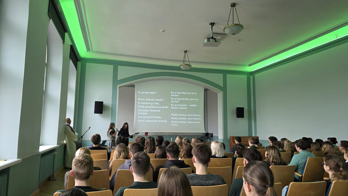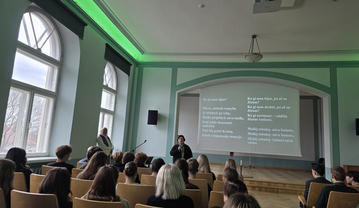 Penktadienio rytą gimnazijoje pradėjome dvasinio susikaupimo valanda. Mus visus pakvietęs susiburti gimnazijos kapelionas, kunigas Evaldas Vitulskis sukūrė labai jaukią, nuoširdžią atmosferą. Ją dar labiau pagyvino gimnazistų atliekamos giesmės, skaitomos Šv. Rašto ištraukos, visus suartino bendra malda. Išsiskirstėme gavę palaiminimą ir palinkėję vieni kitiems gražių artėjančių švenčių.
