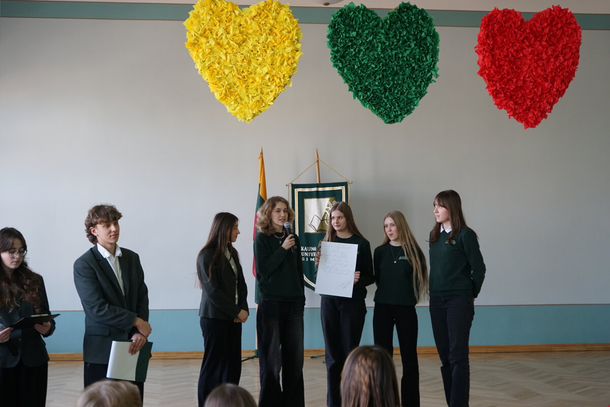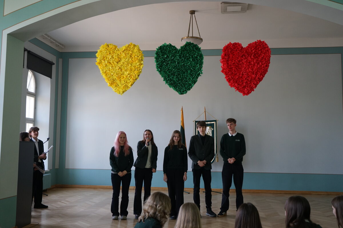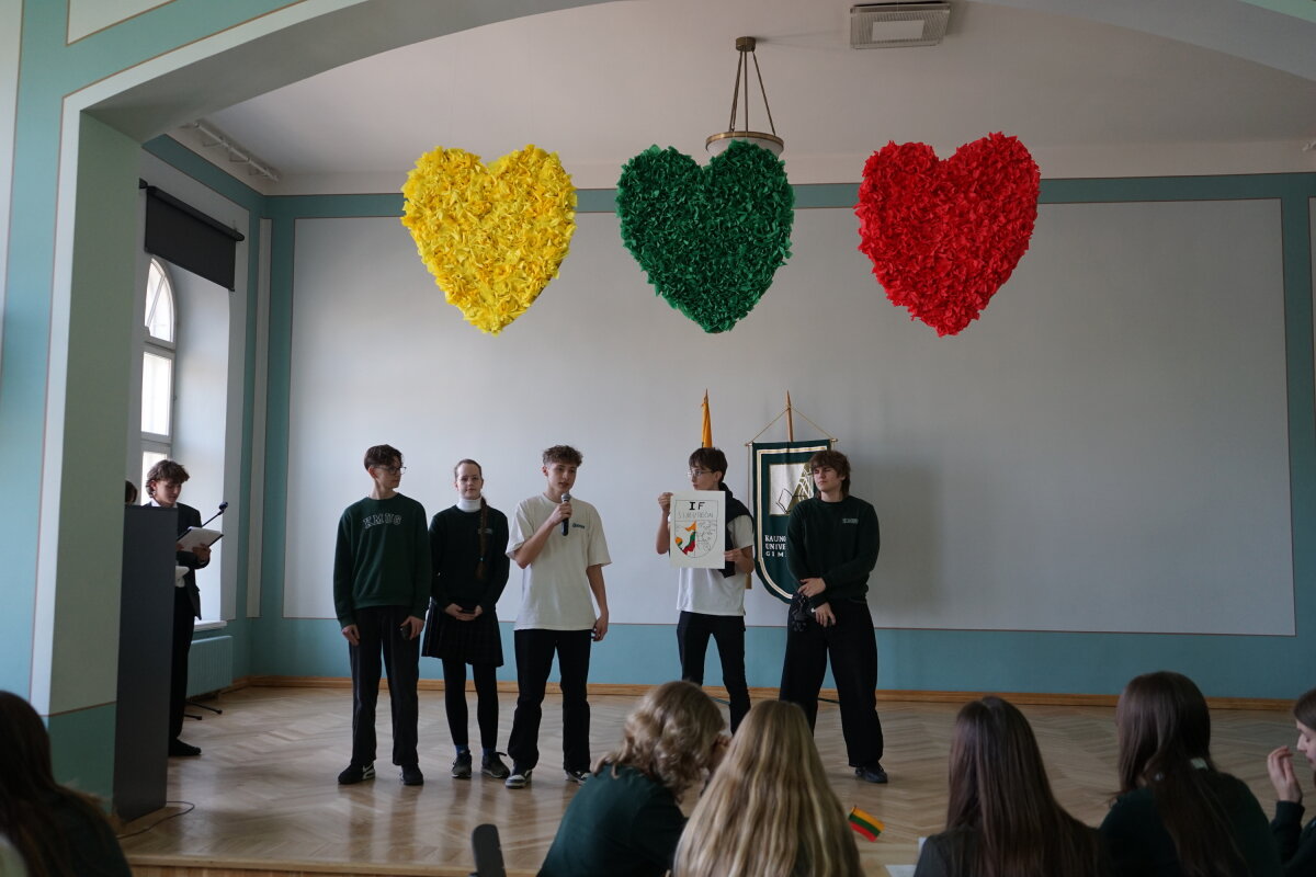 Kovo 9 d. gimnazijos bendruomenė pradėjo renginių ciklą, skirtą Lietuvos Nepriklausomybės atkūrimo dienai – Kovo 11-ajai – paminėti. I klasių gimnazistai rinkosi Steigiamojo Seimo salėje, kur dalyvavo viktorinoje „1990: istorija gyvai – pasirinkimas būti laisviems“. Joje mokiniai pasitikrino žinias apie Lietuvos kelią į laisvę, svarbiausius istorinius įvykius ir asmenybes.