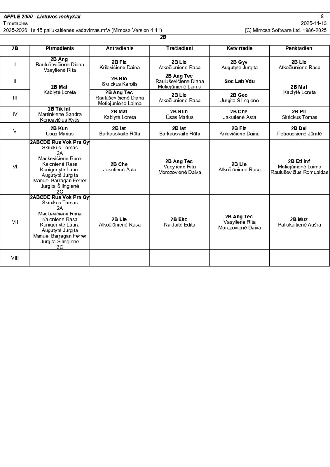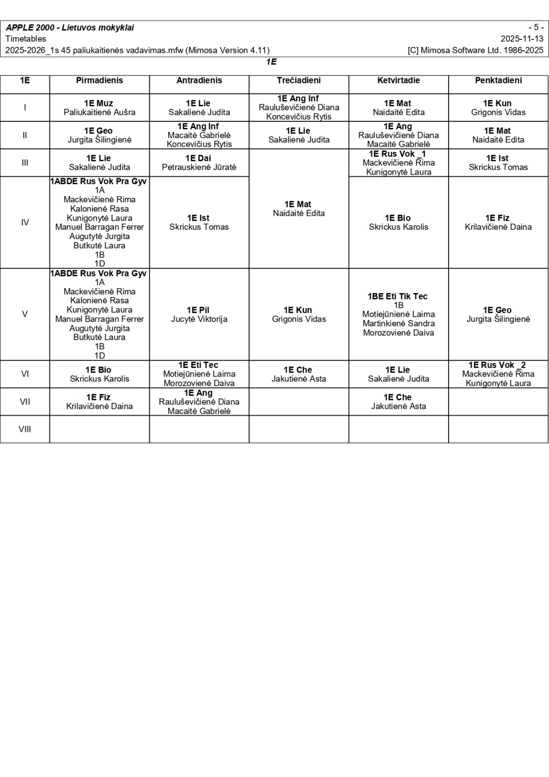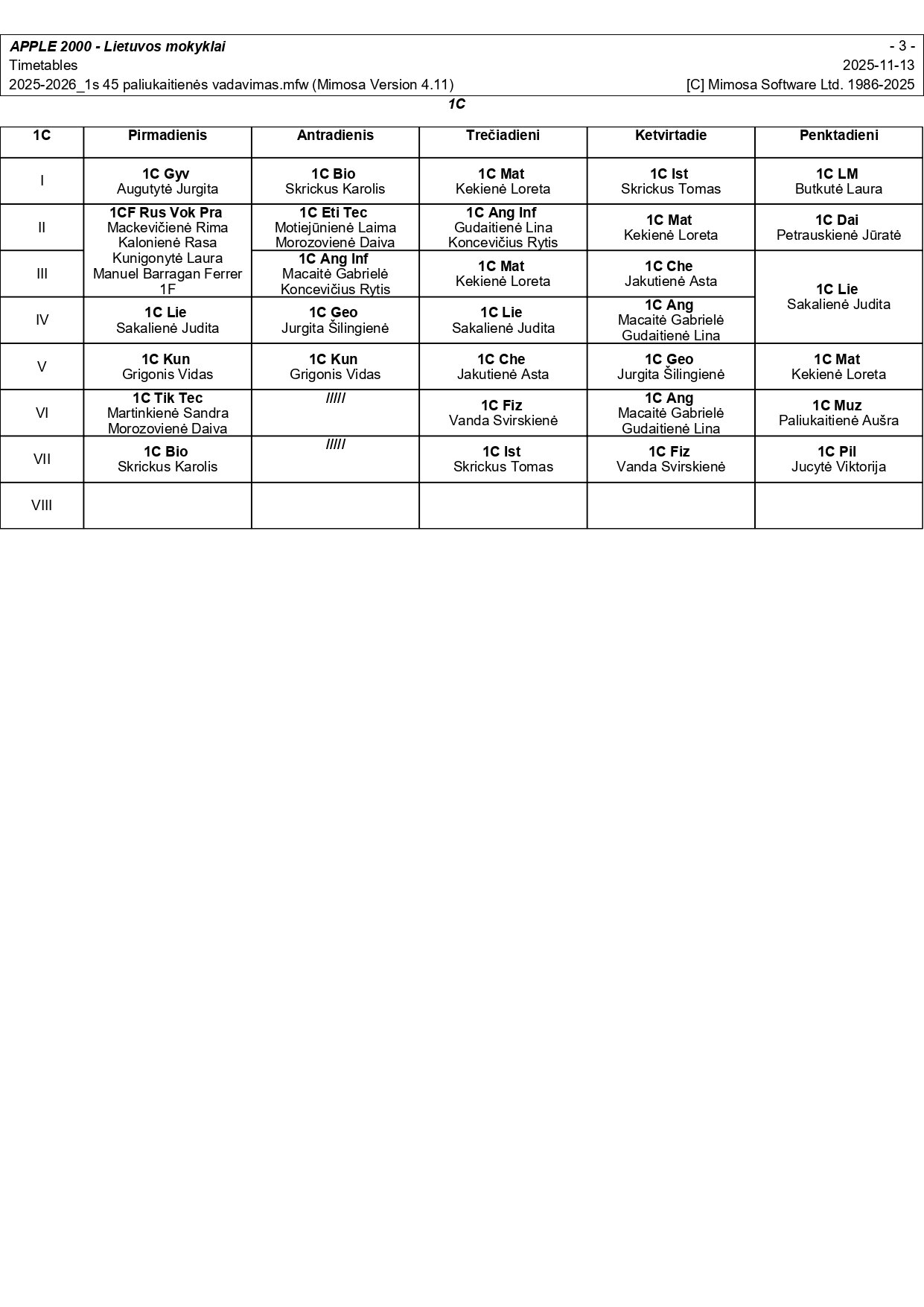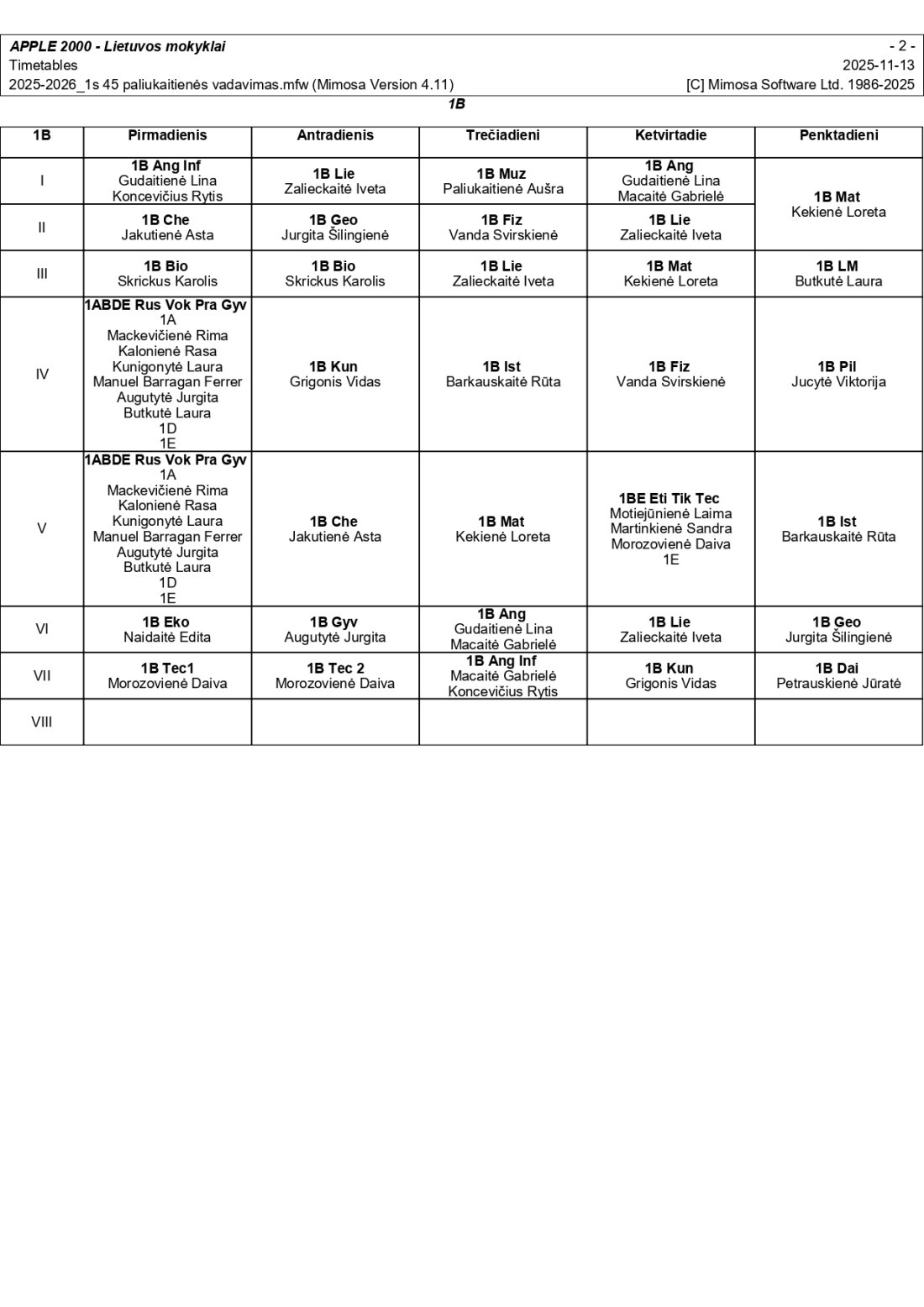 2025–2026 m. m. I-II klasių mokinių pamokų tvarkaraščiai I pusmetis nuo 2025-11-17