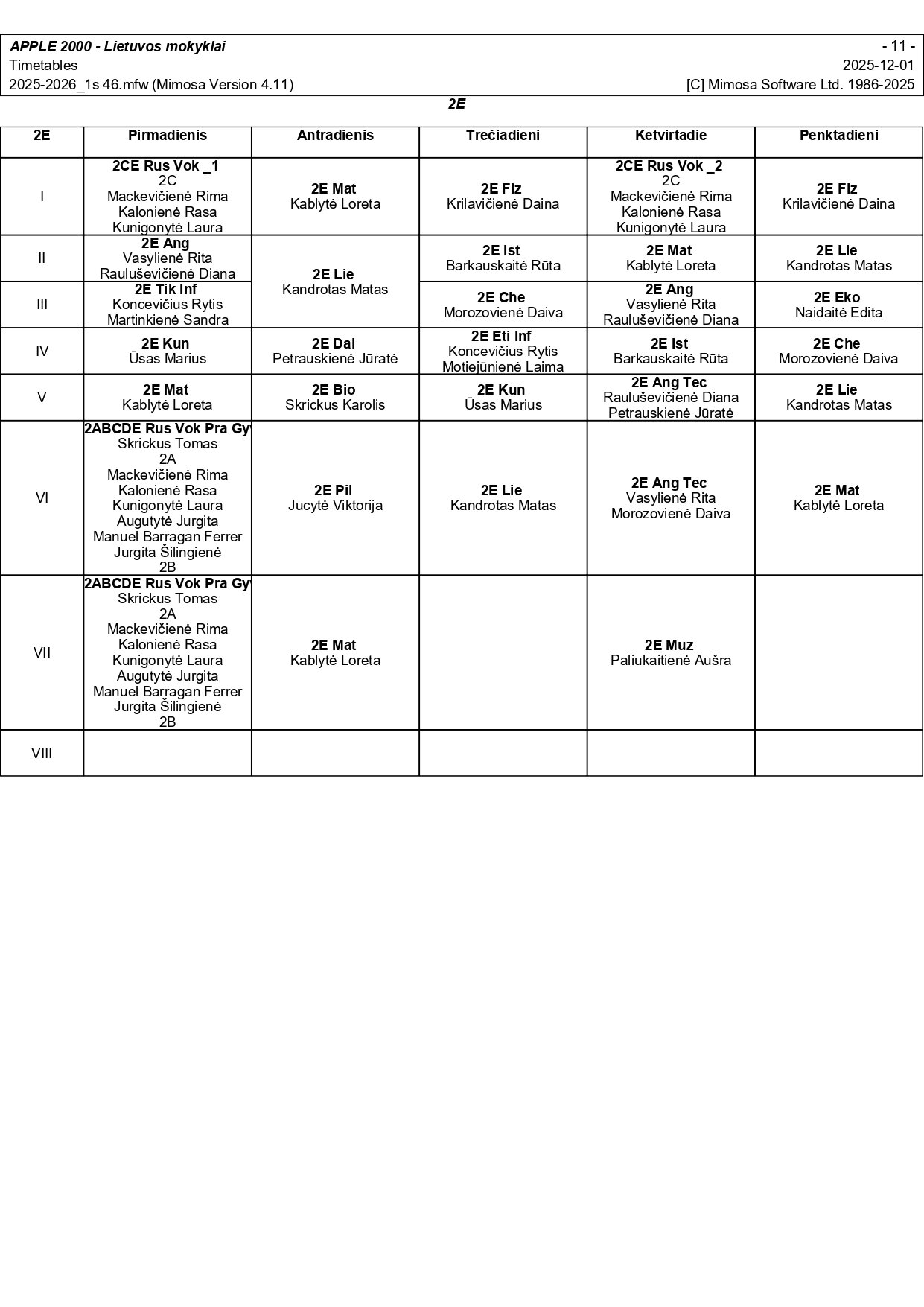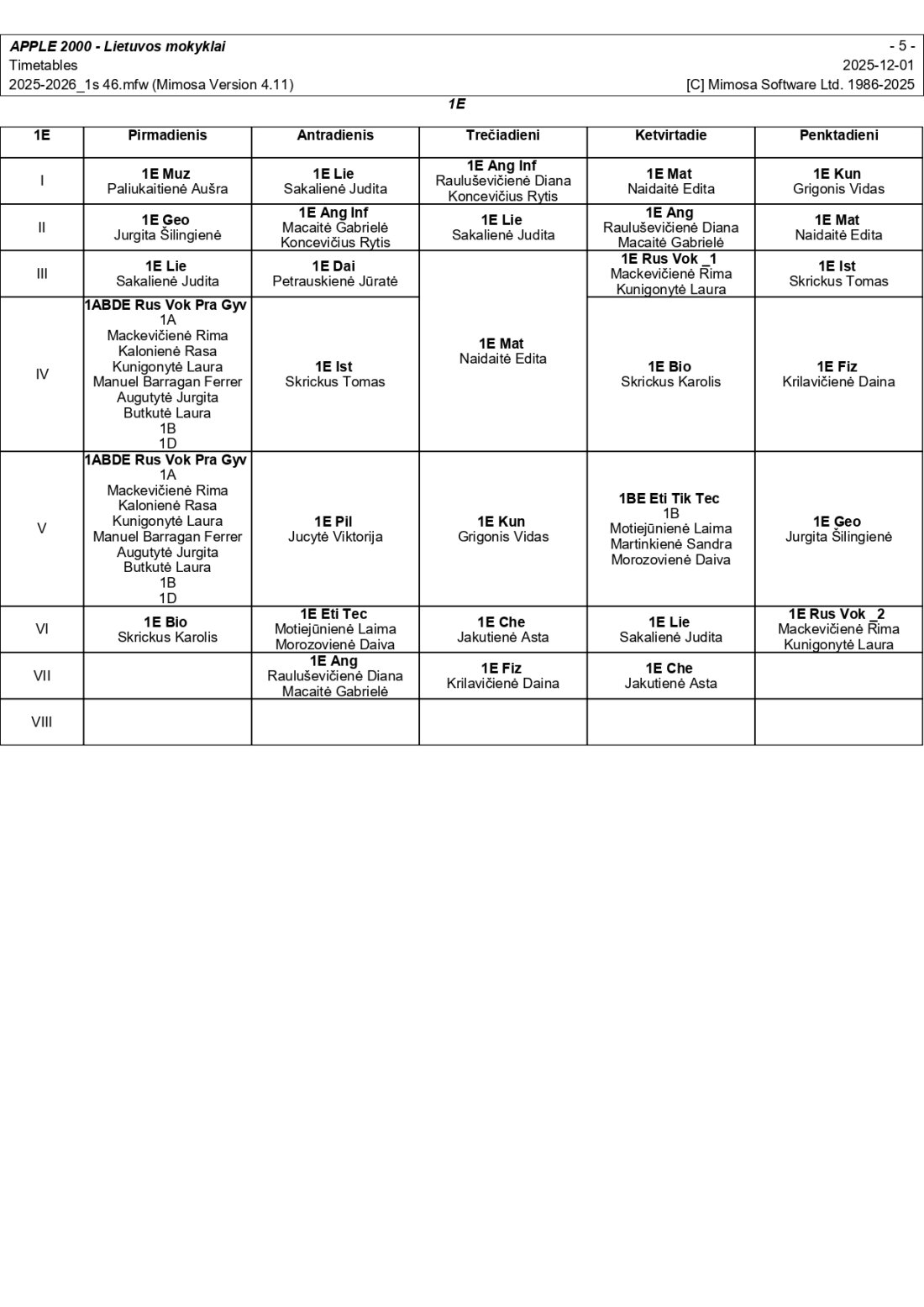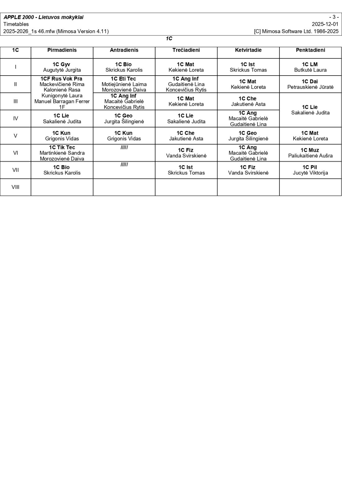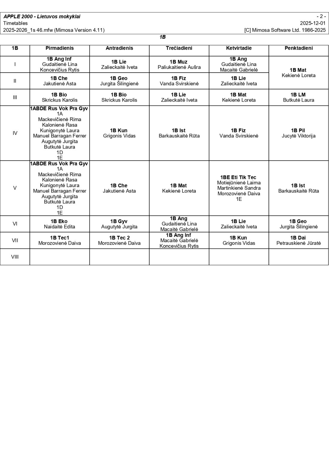 2025–2026 m. m. I-II klasių mokinių pamokų tvarkaraščiai I pusmetis nuo 2025-12-02