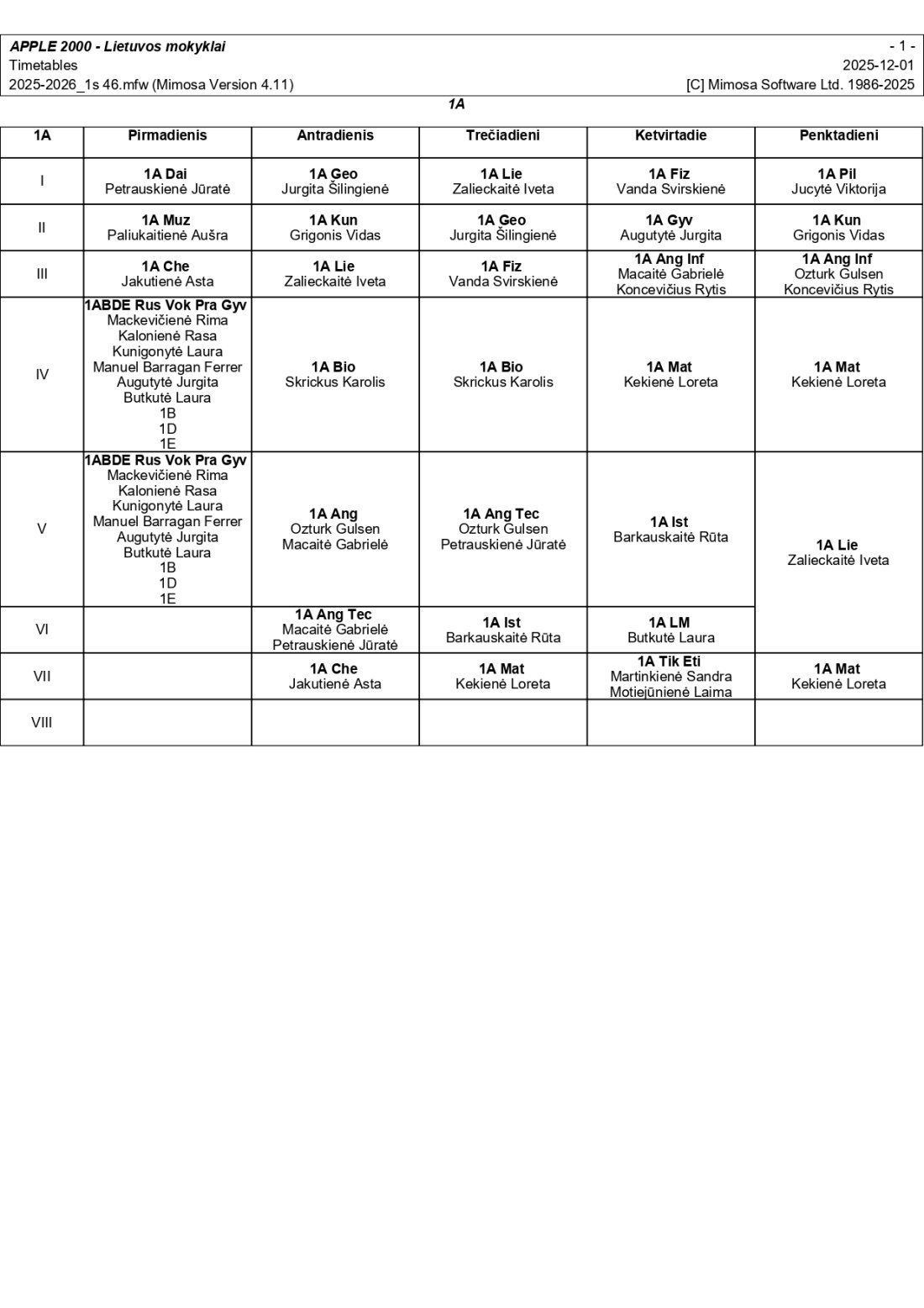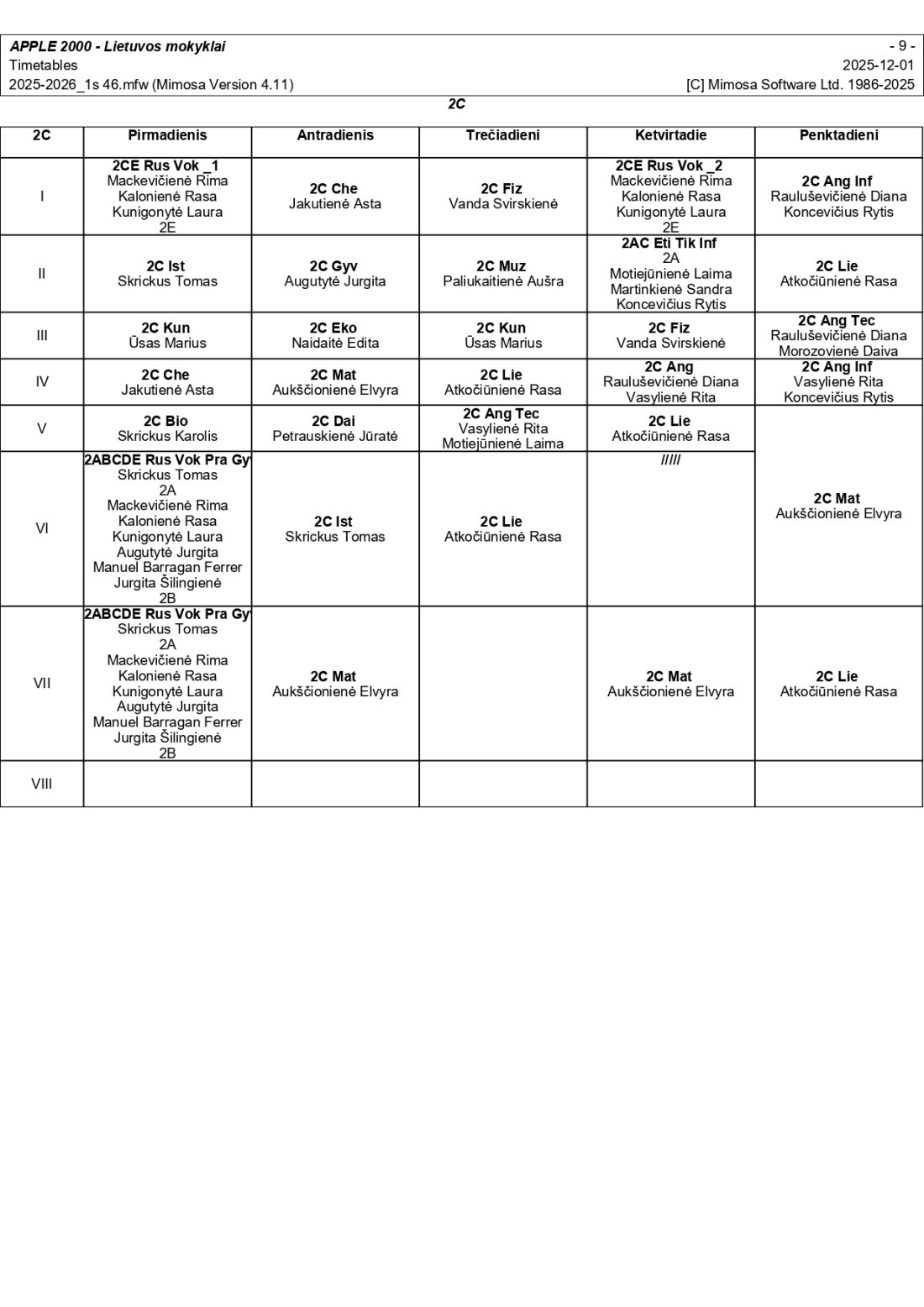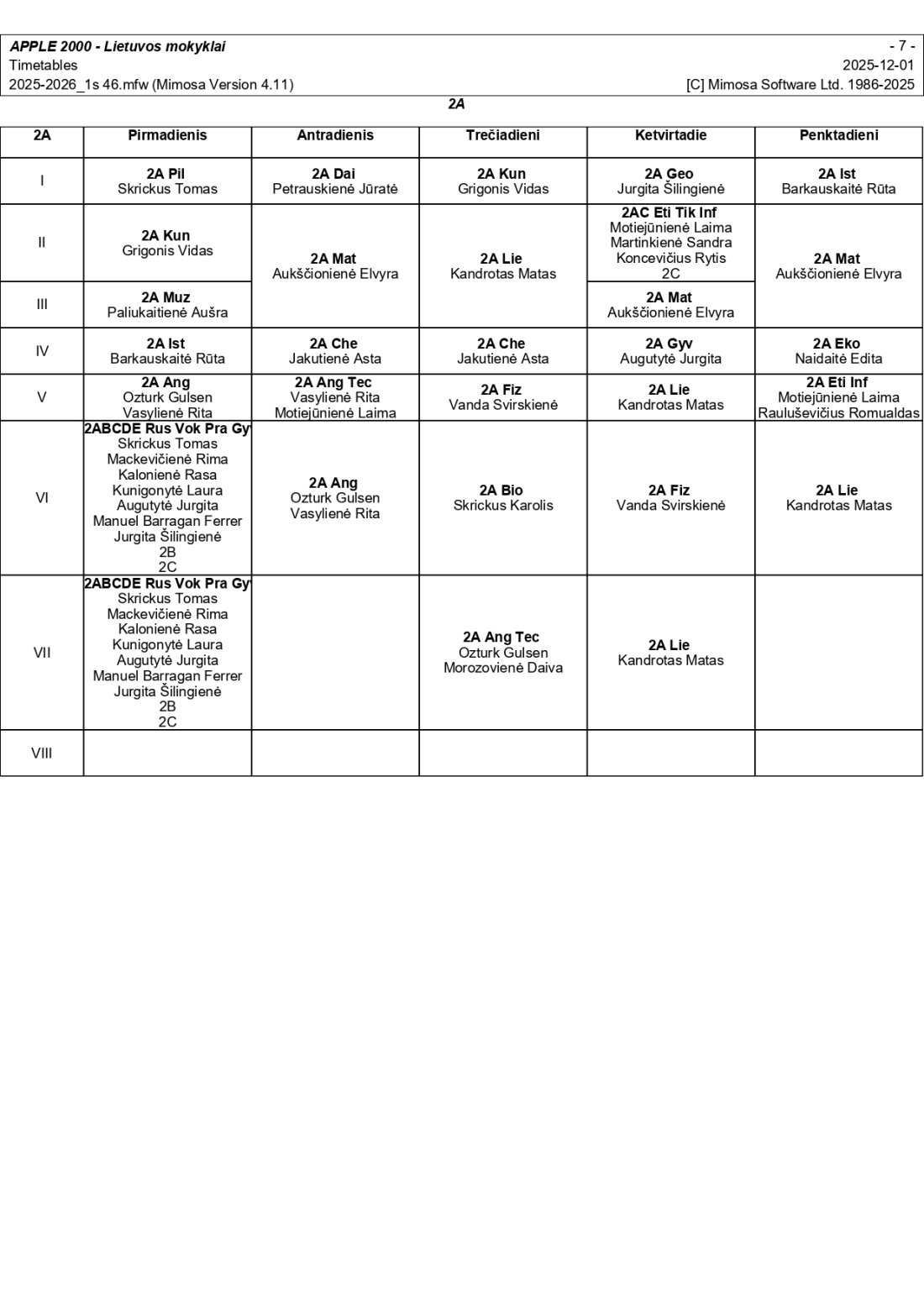 2025–2026 m. m. I-II klasių mokinių pamokų tvarkaraščiai I pusmetis nuo 2025-12-02