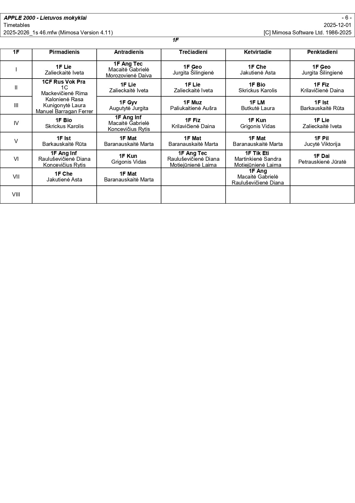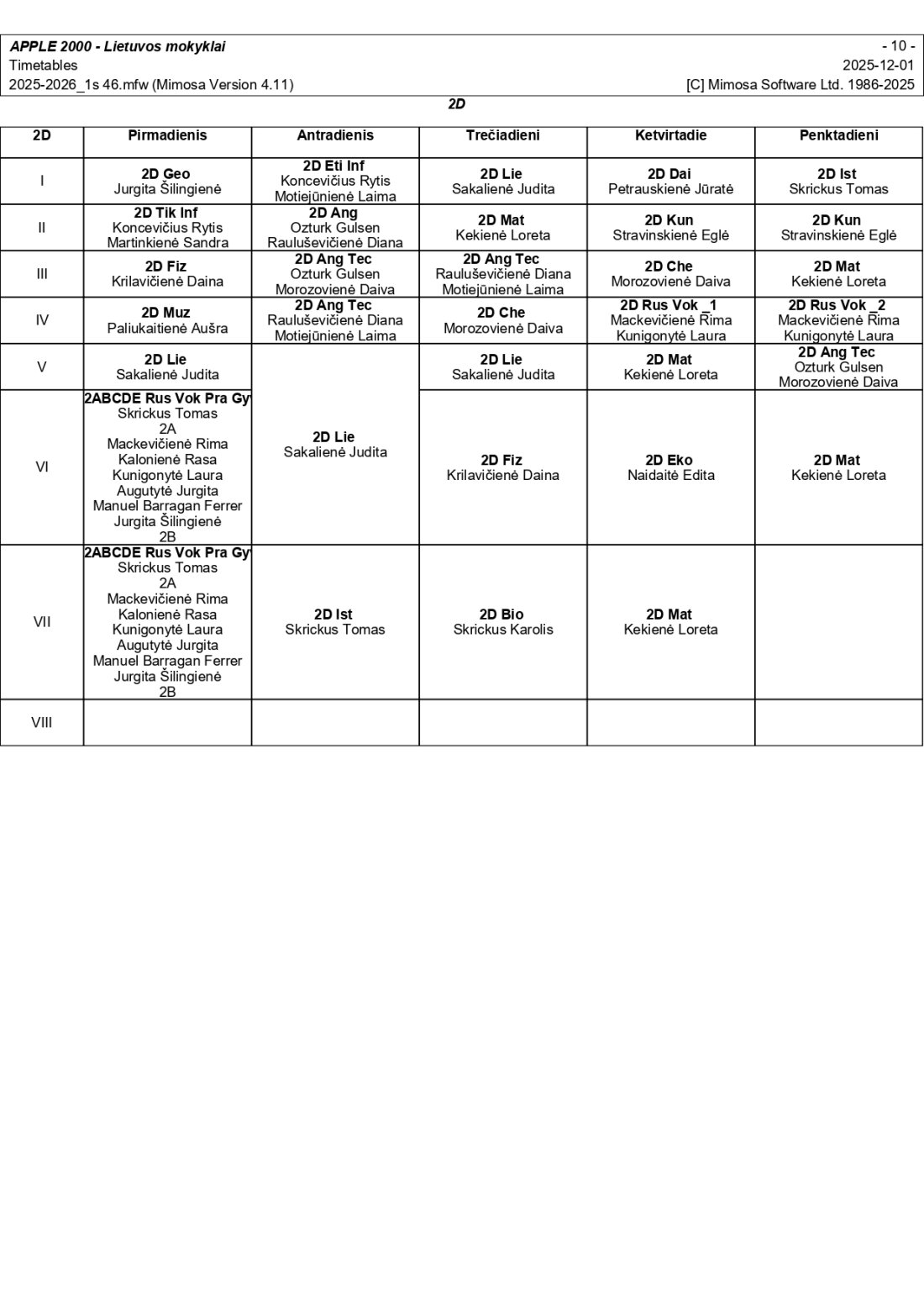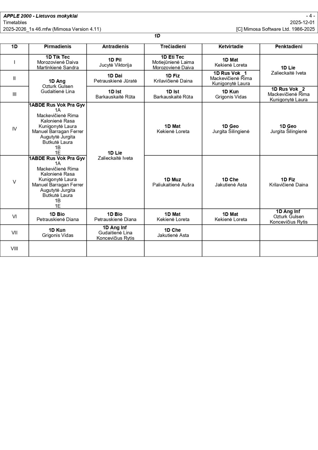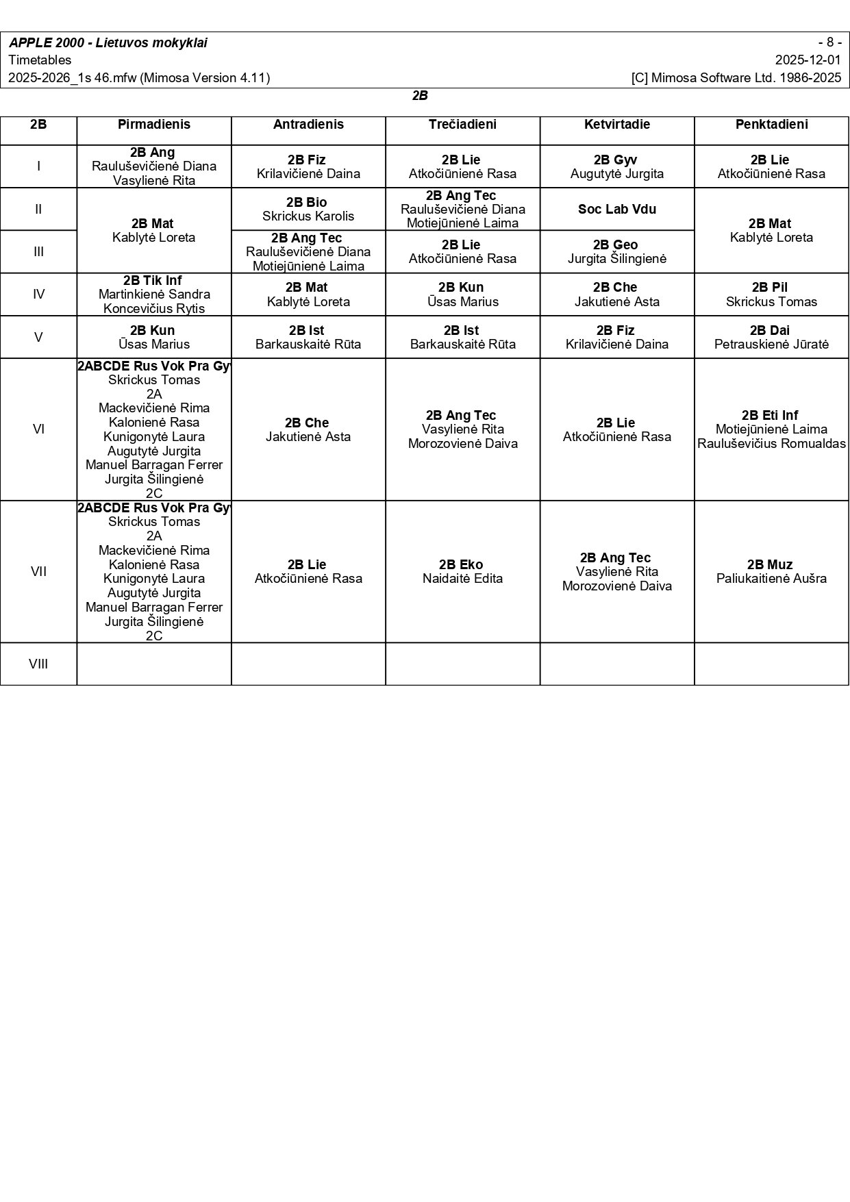2025–2026 m. m. I-II klasių mokinių pamokų tvarkaraščiai I pusmetis nuo 2025-12-02